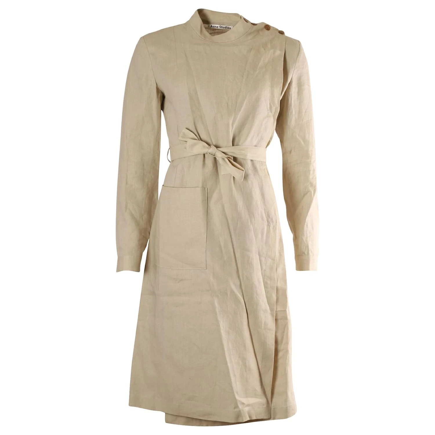 La robe Danita d’Acne Studios est confectionnée dans un lin beige sable, qui est parfait à porter par temps chaud. Il comporte des manches blouson à revers, ceinturé à la taille avec une ouverture asymétrique. Le col ras du cou avec fermetures à boutons sur l’épaule gauche ajoute au style minimaliste. Une grande poche plaquée unique à l’avant complète le look. Portez la vôtre avec des sandales et un sac seau pour un look chic sans effort.