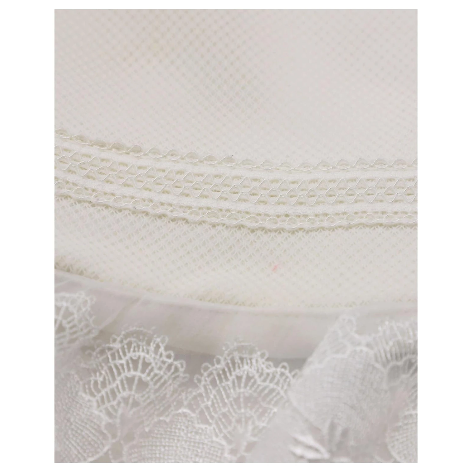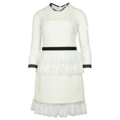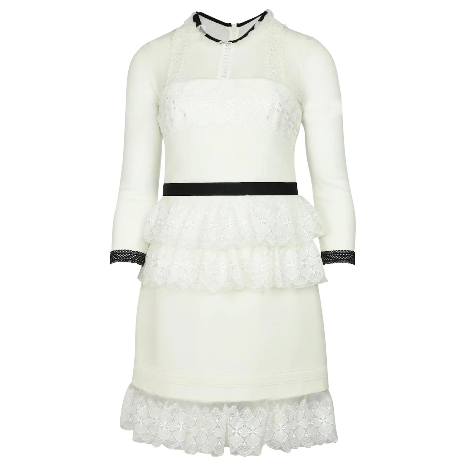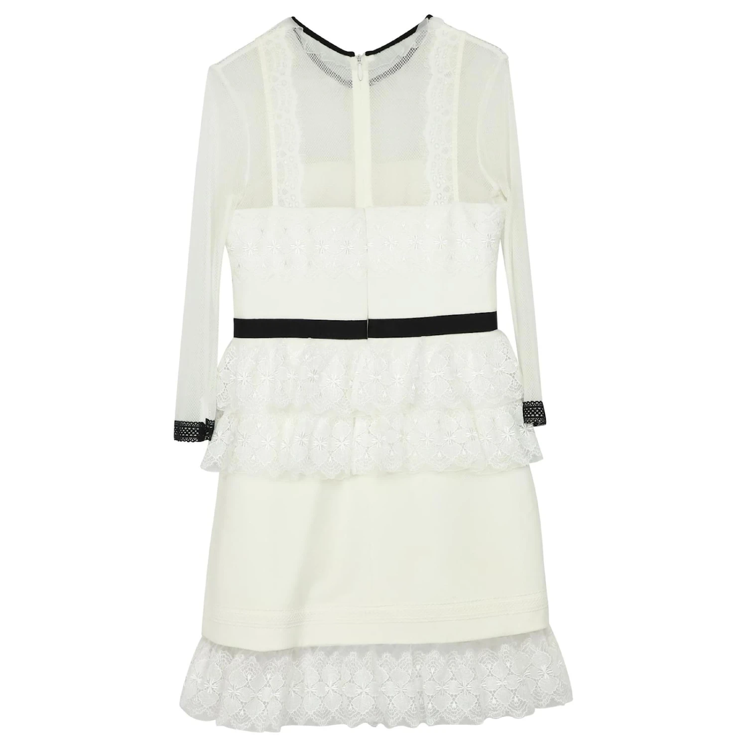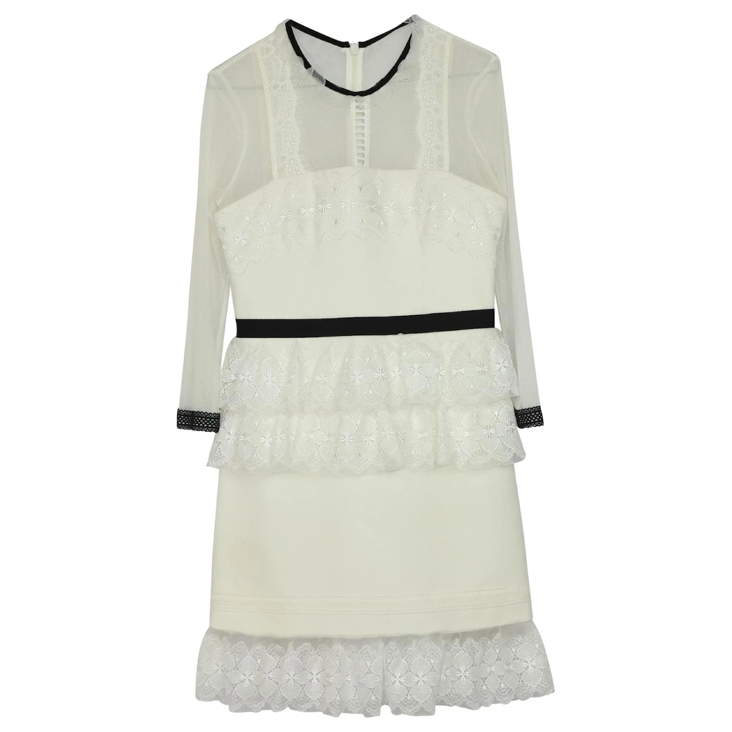 Cette robe duchesse par Three Floor est en polyester blanc cassé avec un col ras du cou, détails en maille transparente, panneaux de dentelle, Détails passepoilés noirs, et une fermeture éclair cachée.