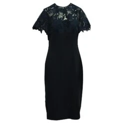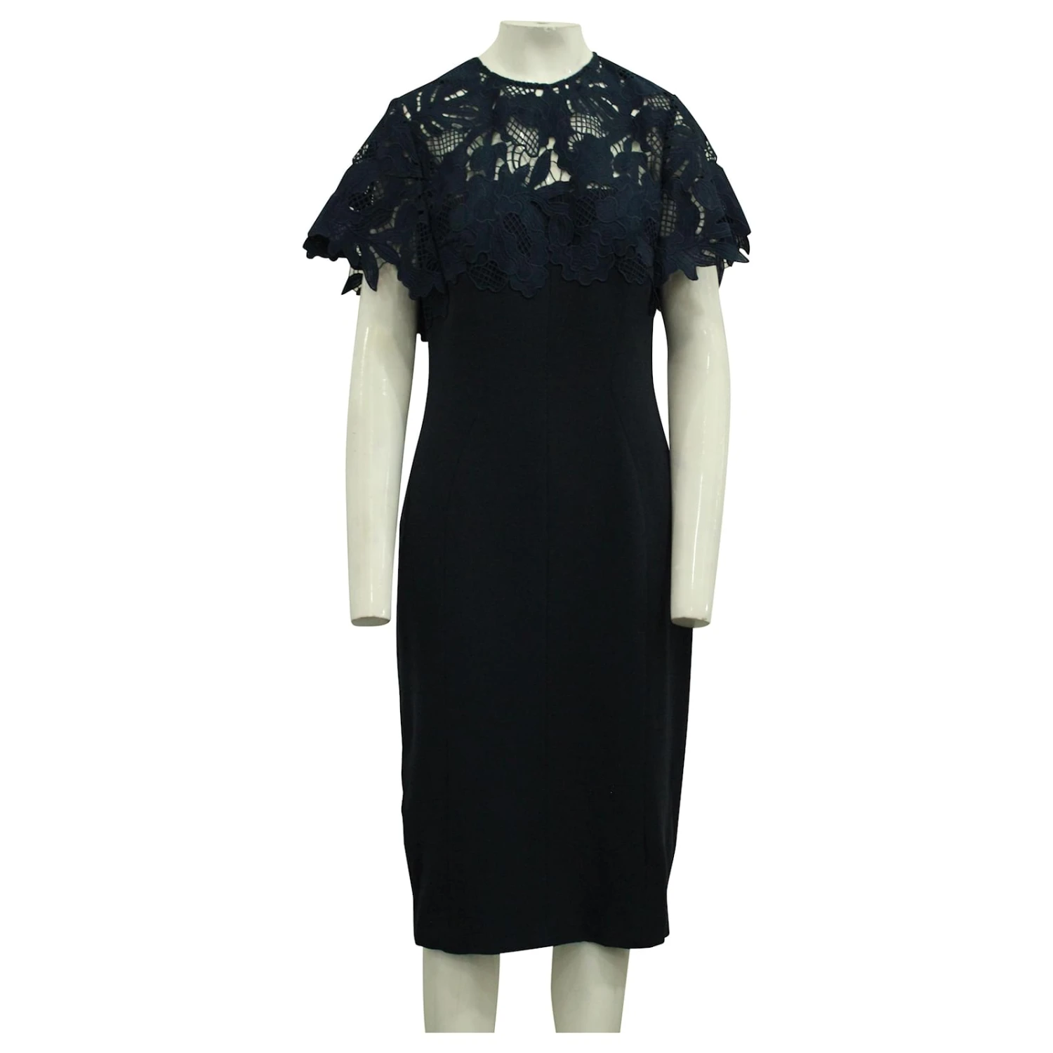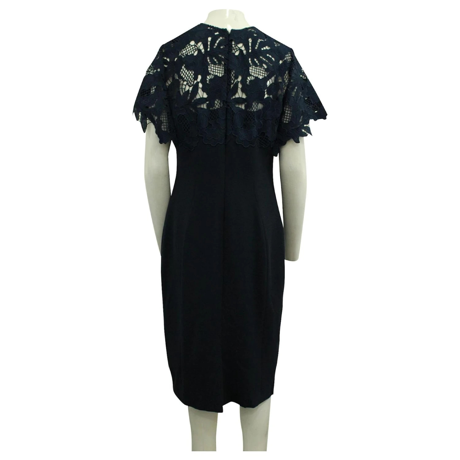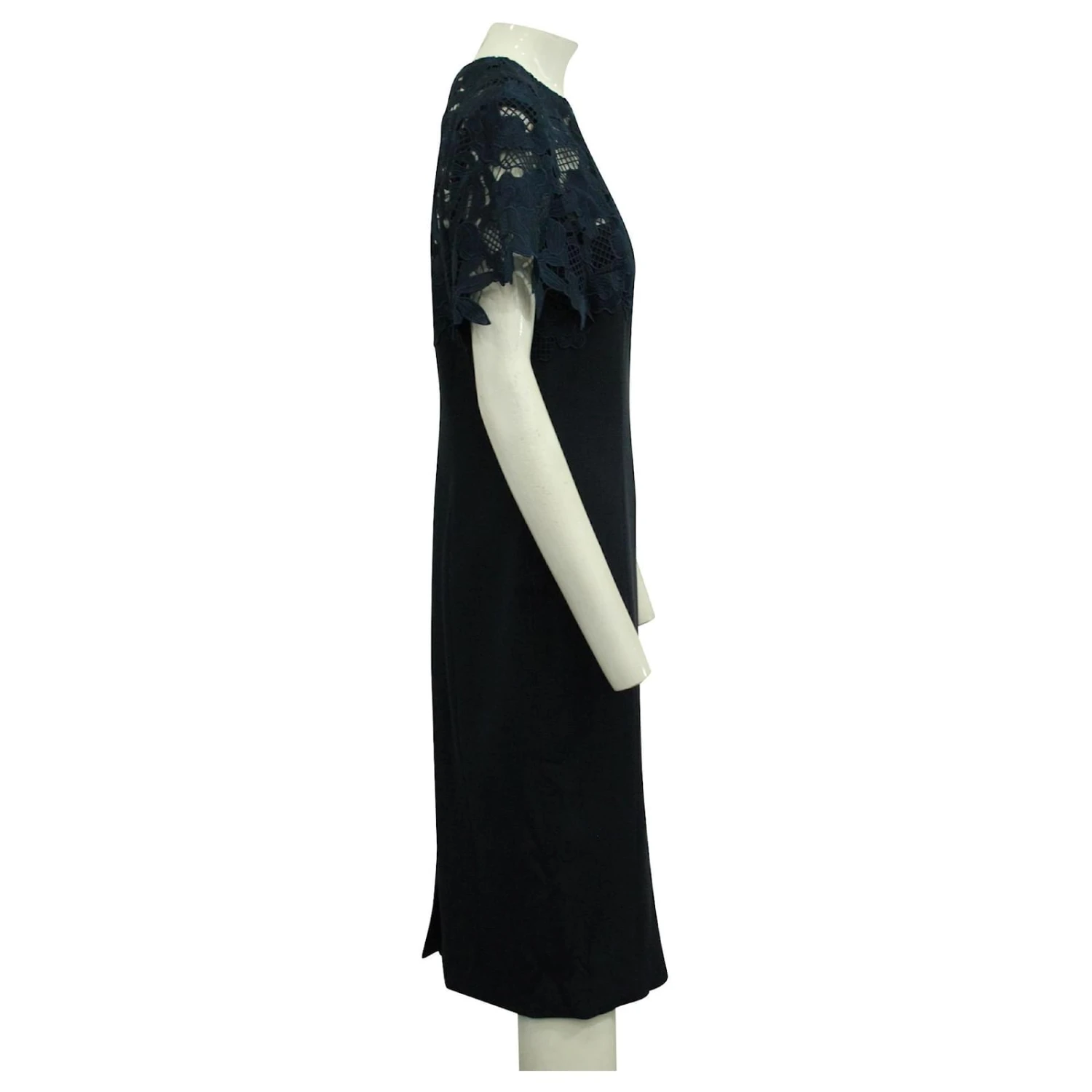 Robe en dentelle et laine bleu marine. fermeture à glissière au dos. Très bon état avec quelques marques sur le devant. made in USA.