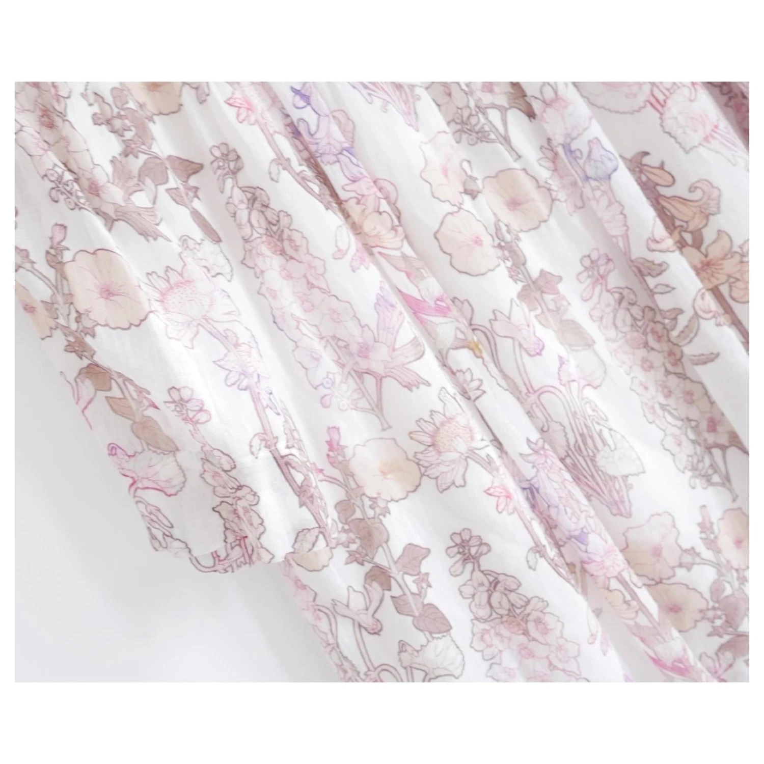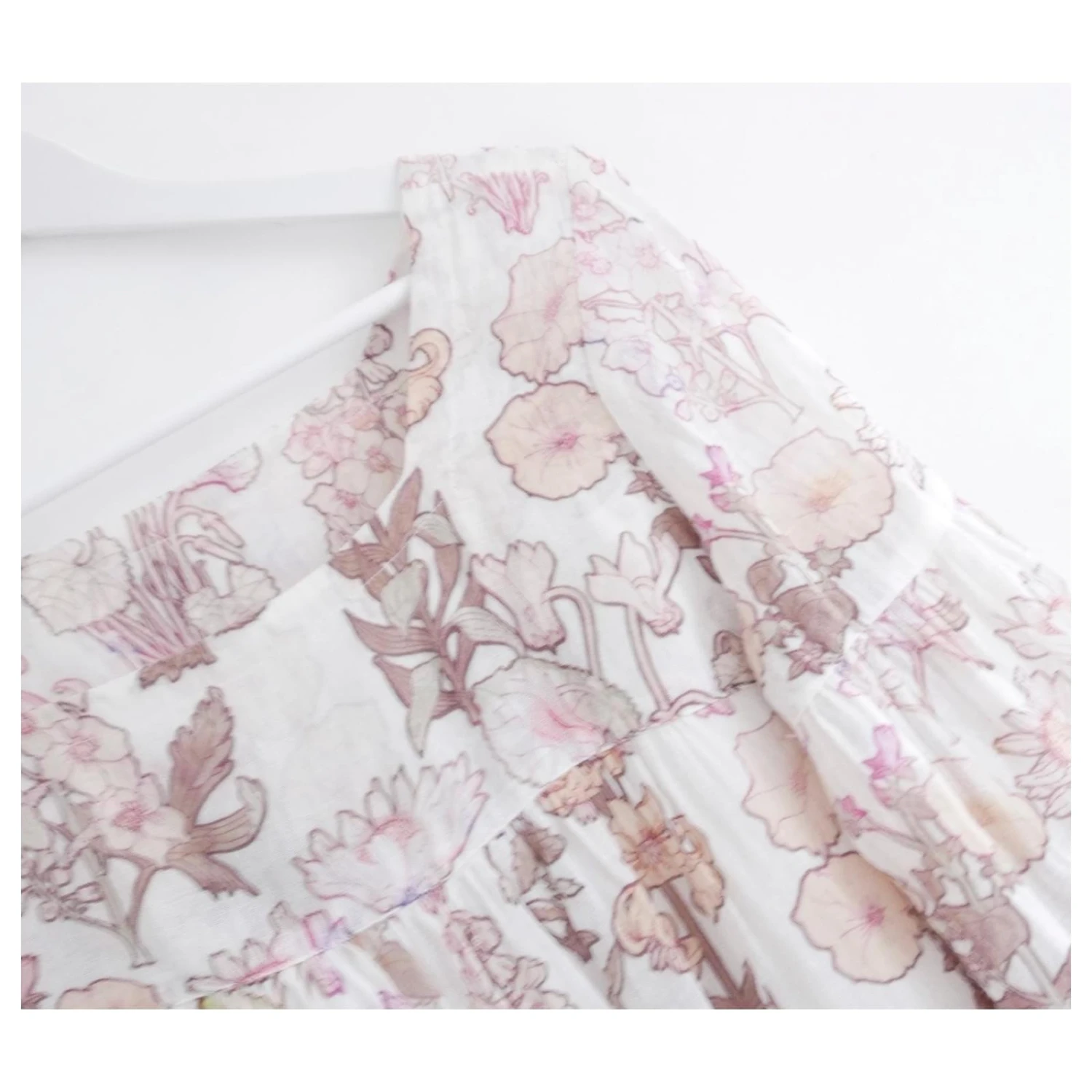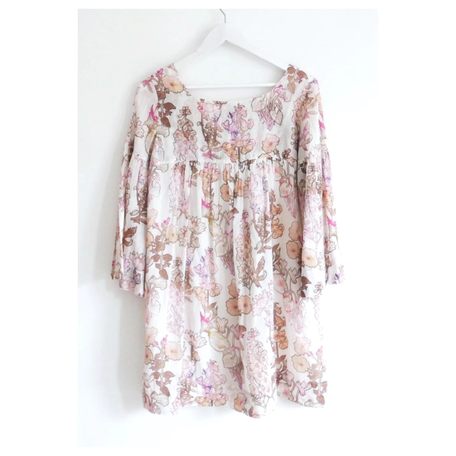 Fabriqué à partir de super fine, étamine douce à imprimé floral pâle avec une doublure en soie, il a une coupe babydoll super décontractée avec une encolure dégagée et une jupe ample. size 0 et est une coupe ample. Mesure environ – buste 38”, hanches pleines et longues 33”.