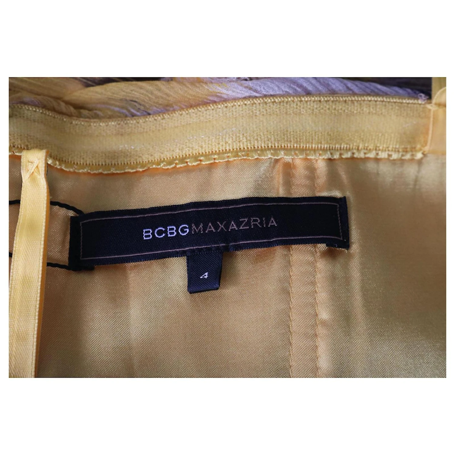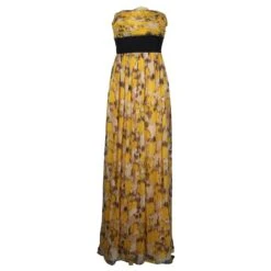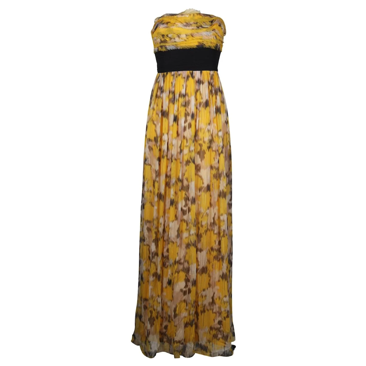 Corsage à plusieurs niveaux sans bretelles avec une longue jupe flottante douce. Ceinture noire à nouer. 100% silk. Doublure entièrement de couleur jaune. fermeture à glissière au dos. Pièce unique de soirée et de fête. en très bon état général. made in china.