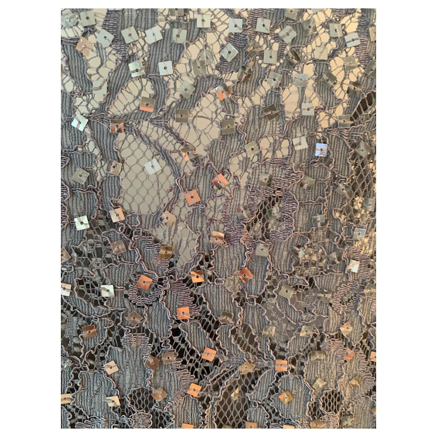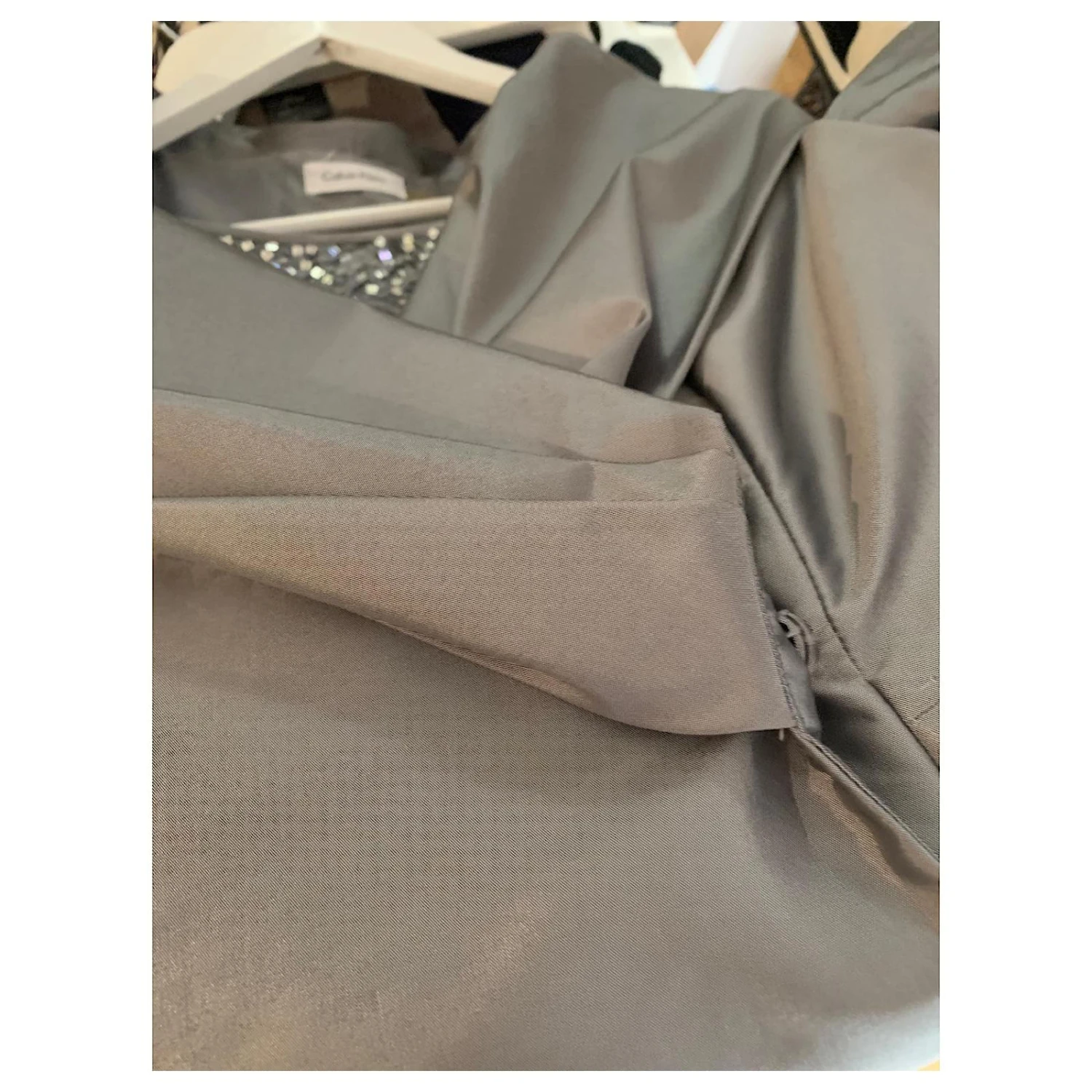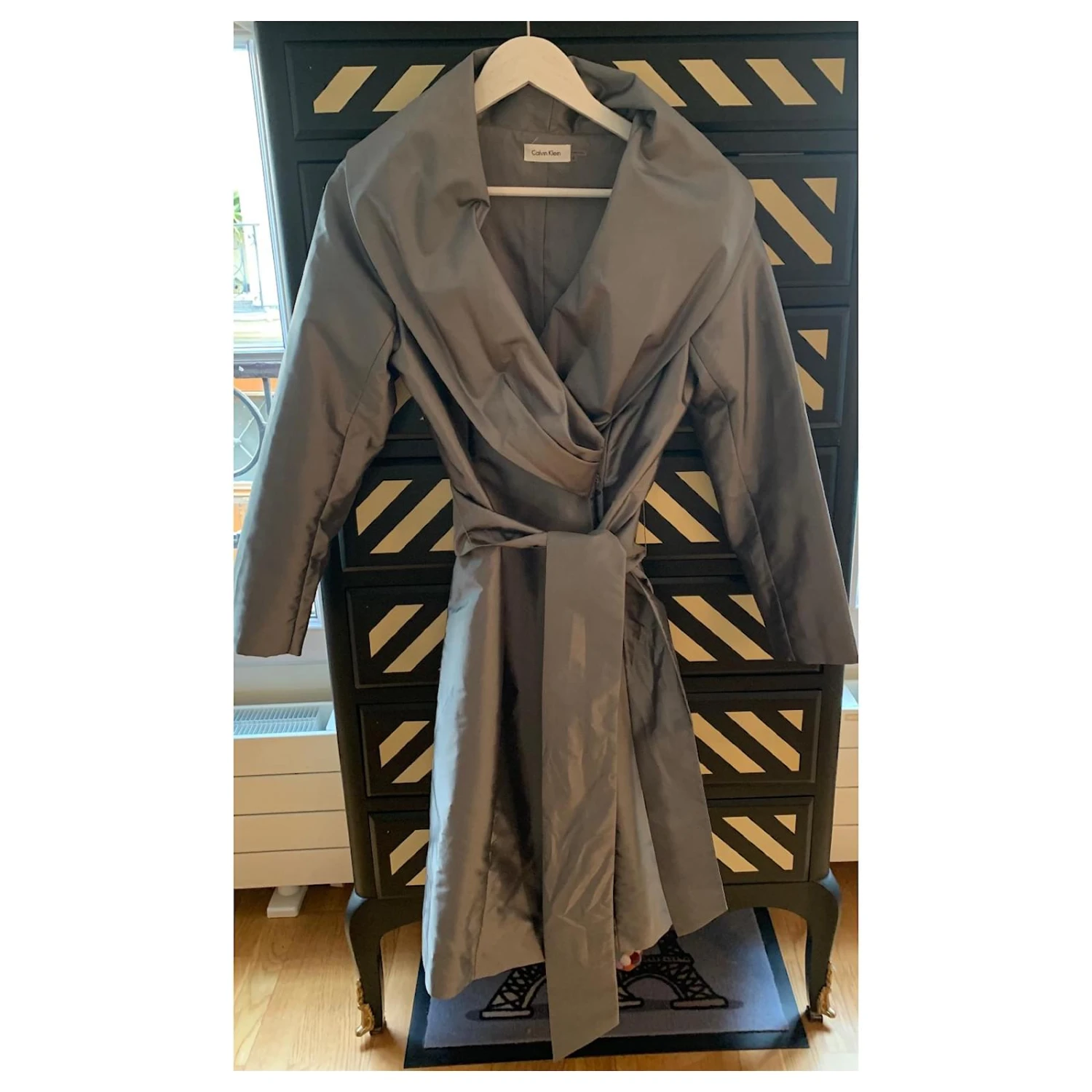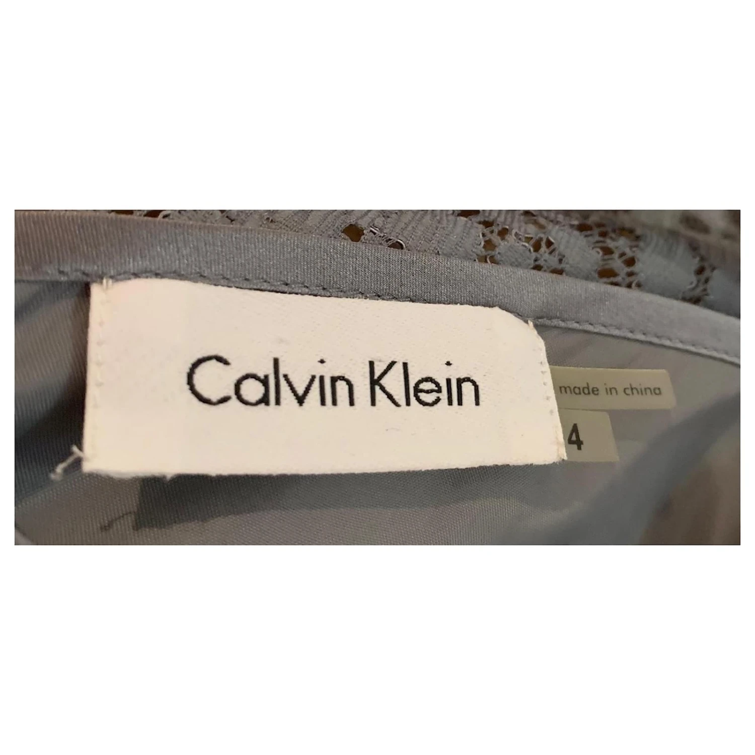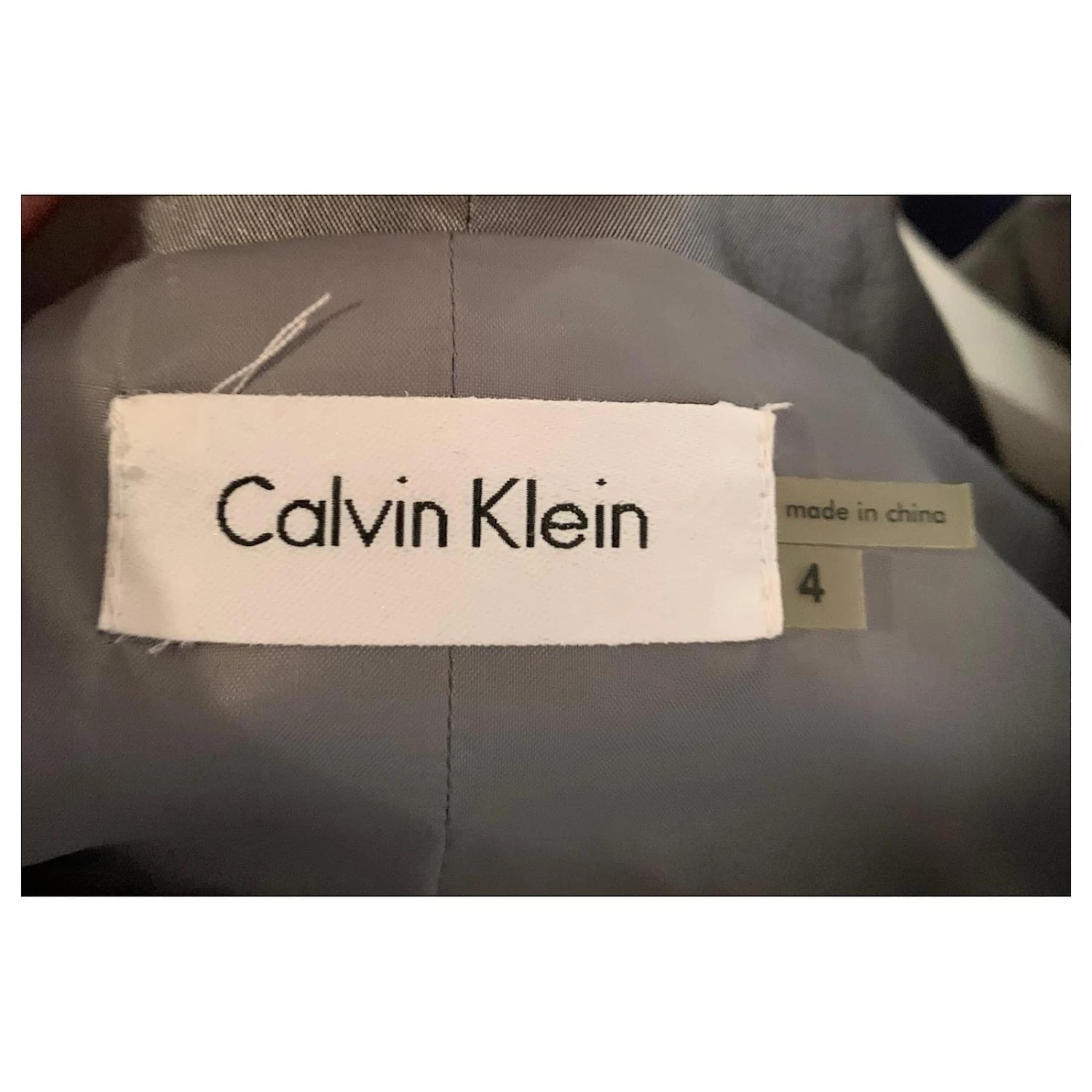Tailleur manteau et robe Calvin Klein gris argenté. Robe droite dentelle sans manche, ras de cou, doublé. Manteau grand col fermé par 2 grosses pressions et ceinturé. Taille 4 americaine mais correspondant à un 38