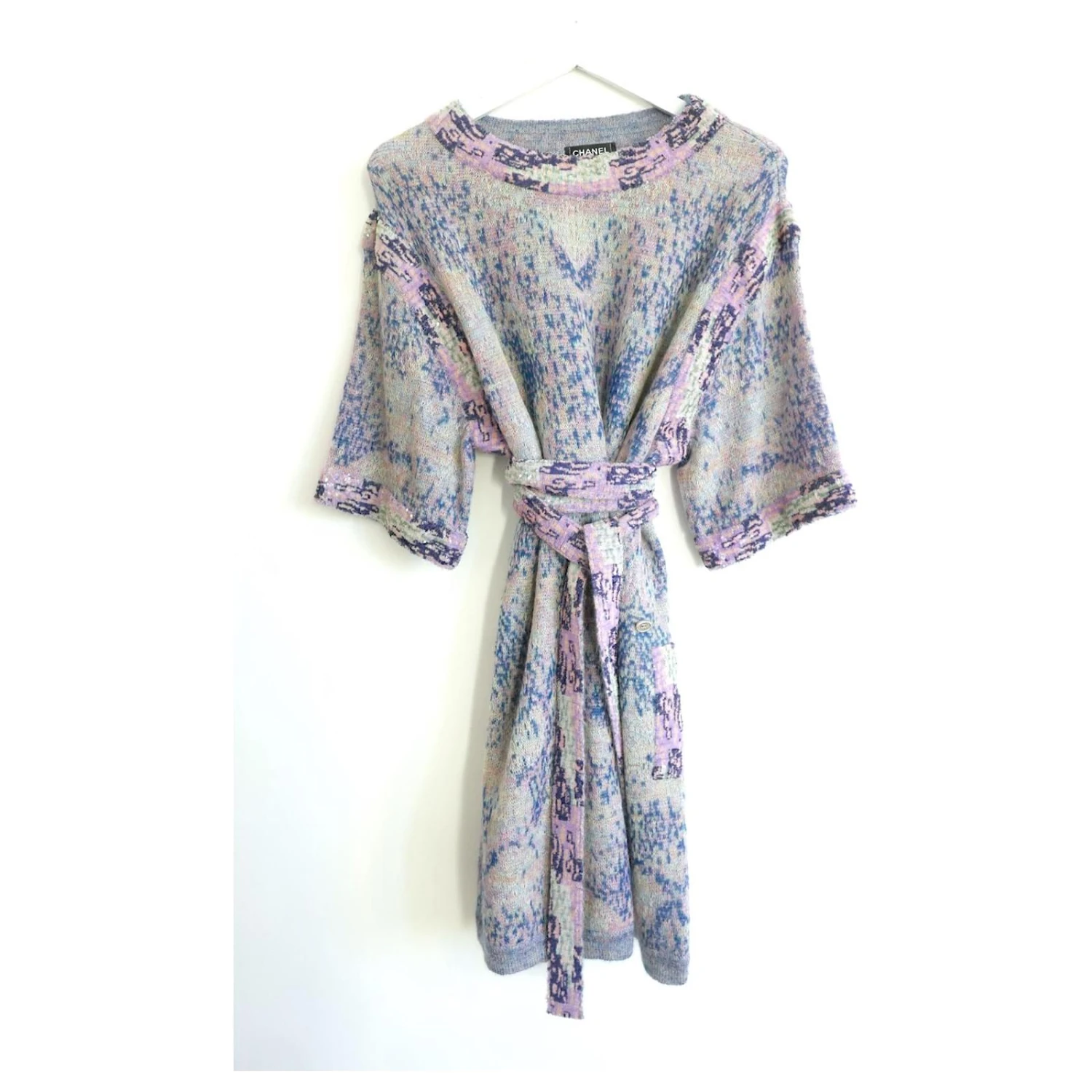 en doux, mélange de mohair moelleux tricoté avec un motif pastel abstrait inspiré du tweed et de minuscules ornements à paillettes. Il a une coupe ample inspirée du kimono avec de larges manches courtes, poches latérales (encore cousue) et ceinture à nouer extra longue en option. Insigne du logo CC en métal texturé sur une hanche. Size FR44/ROYAUME-UNI14 et l’ajustement est très flexible. Mesure environ – buste / taille / hanches 50″Et longueur 36.5”.