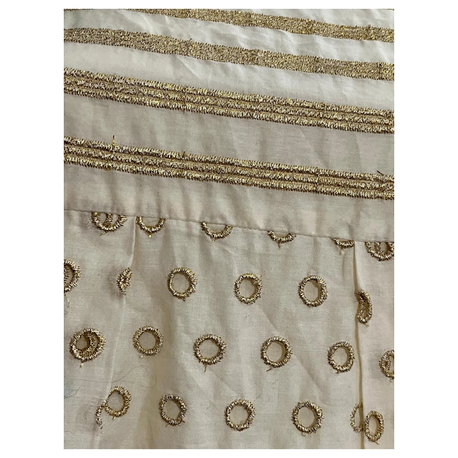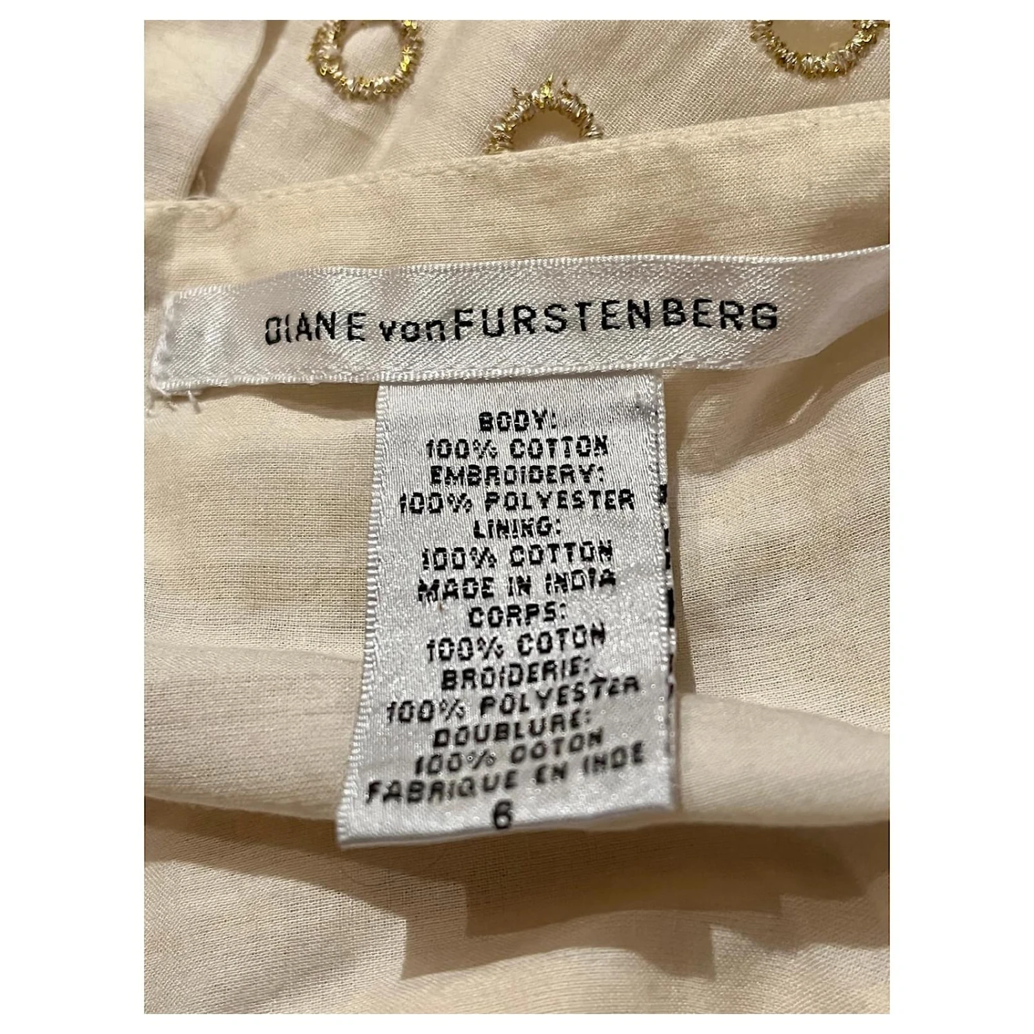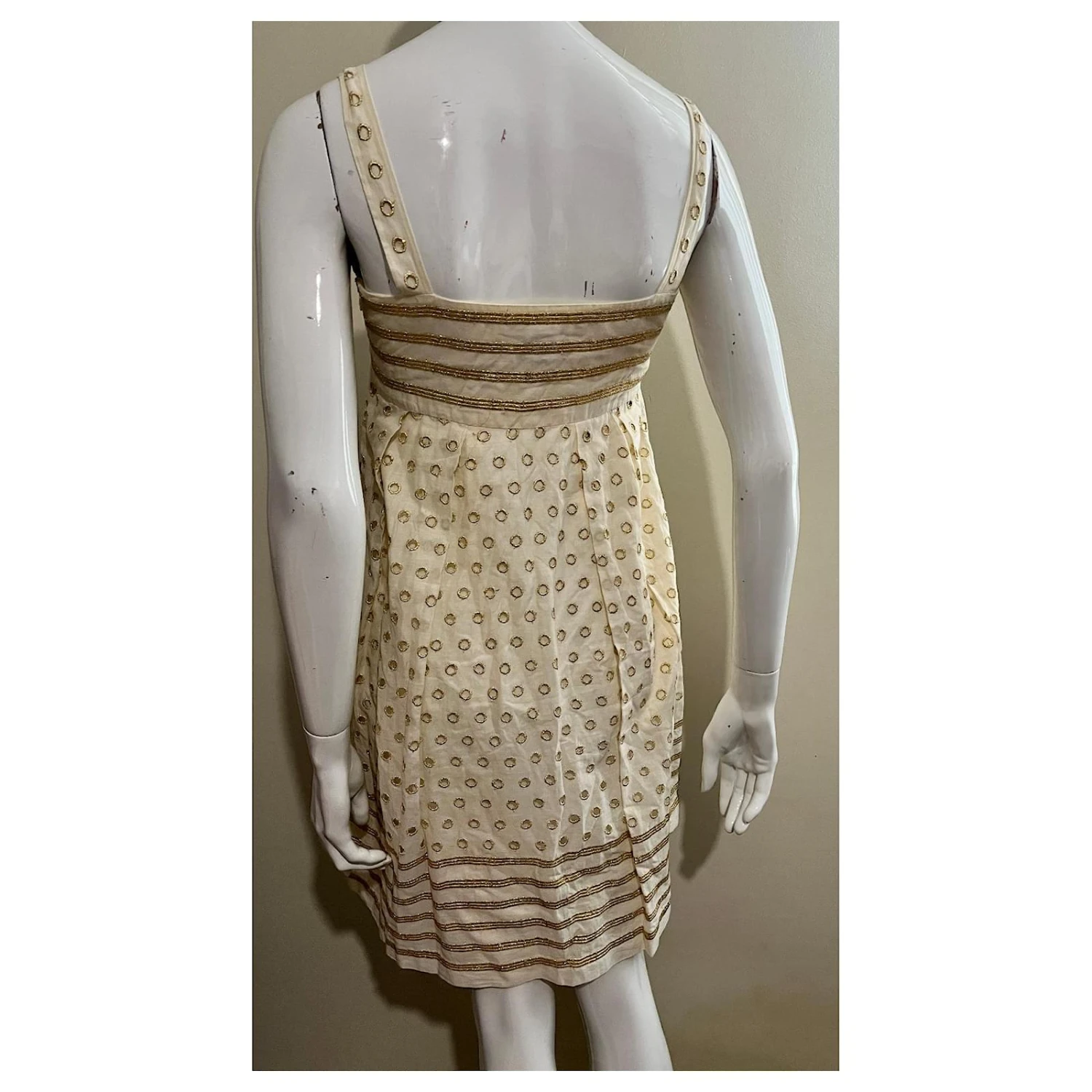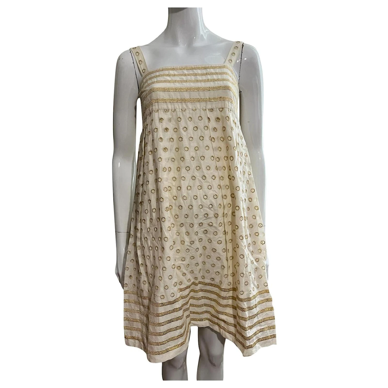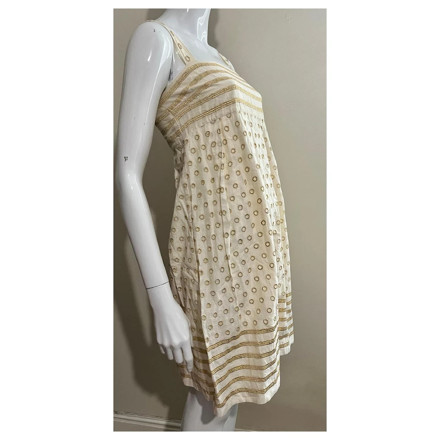 Rare robe vintage Diane von Furstenberg Bobbi en or pâle avec broderies dorées, partiellement broderie Anglaise, Fully lined, poches de couture cachées et une fermeture à glissière latérale dissimulée, la coupe est une ligne A et elle a 2 Bandoulières.