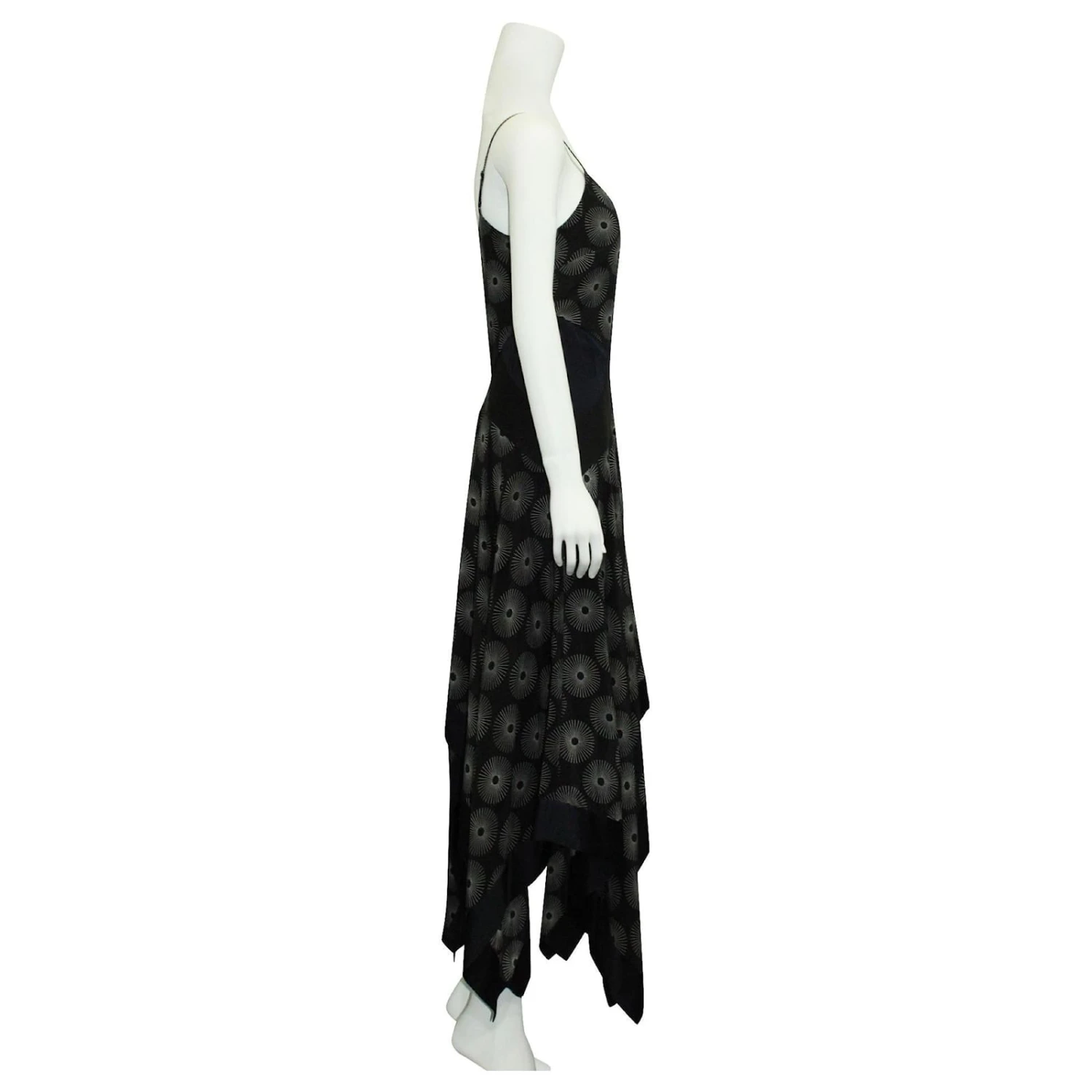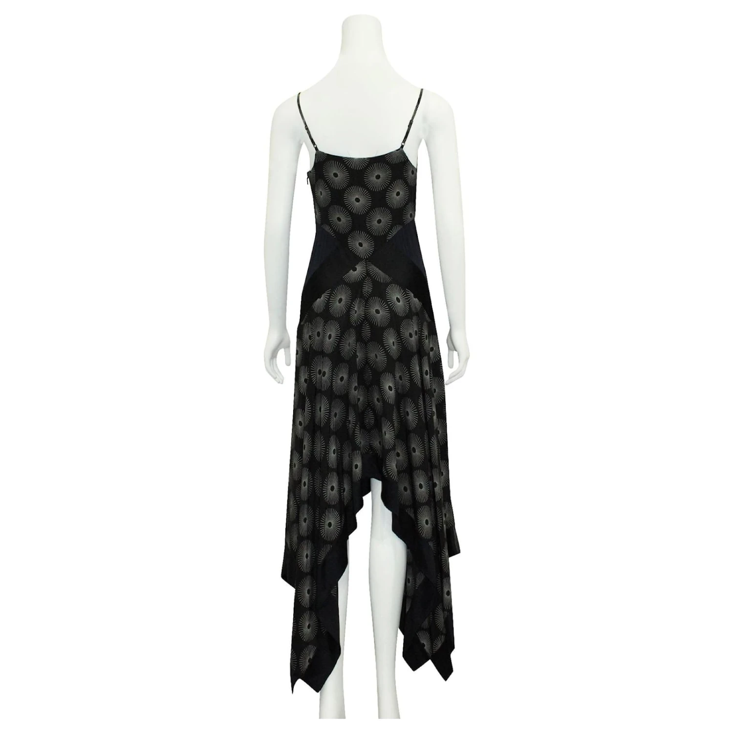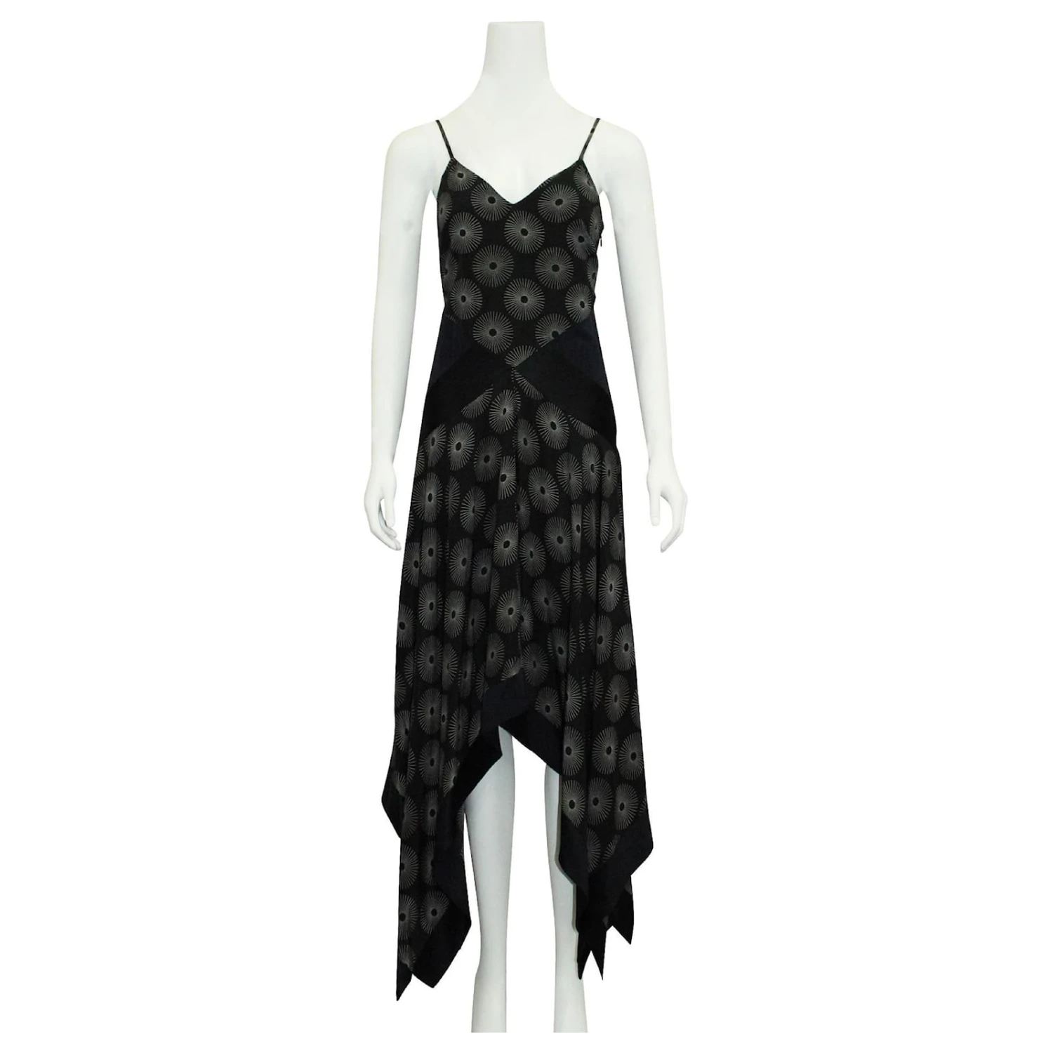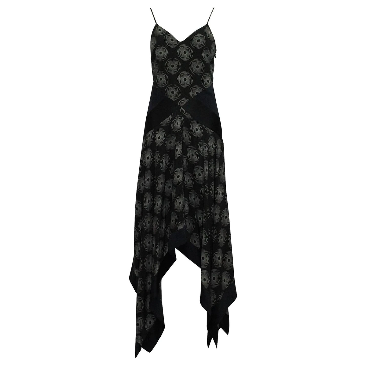 Soie noire à motif soleillé blanc avec empiècements bleu marine et ourlet asymétrique. made in china.