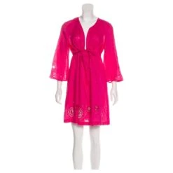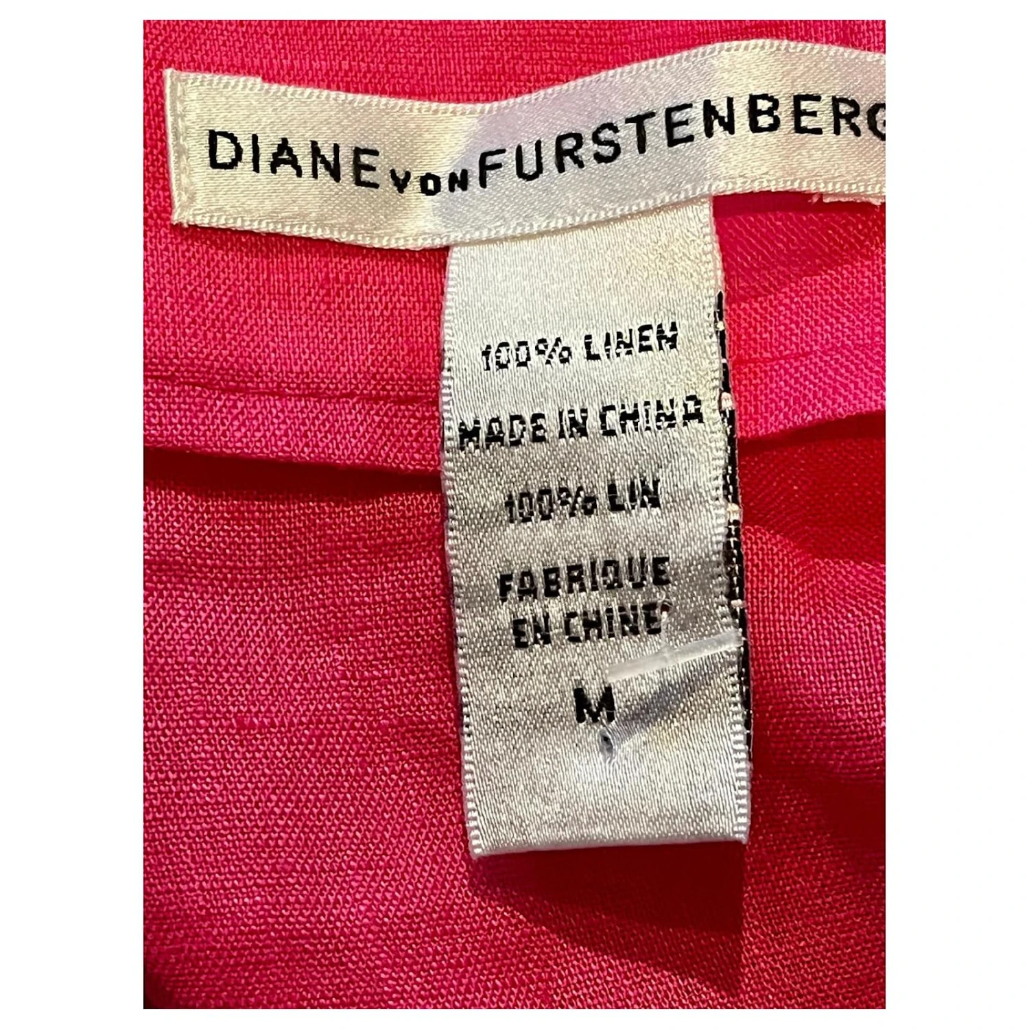 Robe en lin DvF Kleio dans un magenta vibrant. Robe en lin rose Diane von Furstenberg Kleio avec oeillet (broderie anglaise) ACCENTS, décolleté plongeant, manches trois-quarts et cordon de serrage à la taille. Super polyvalent, peut être porté comme une robe tunique ou une couverture sur la plage en raison de la matière légère en lin et 3/4 manches façon trompette.