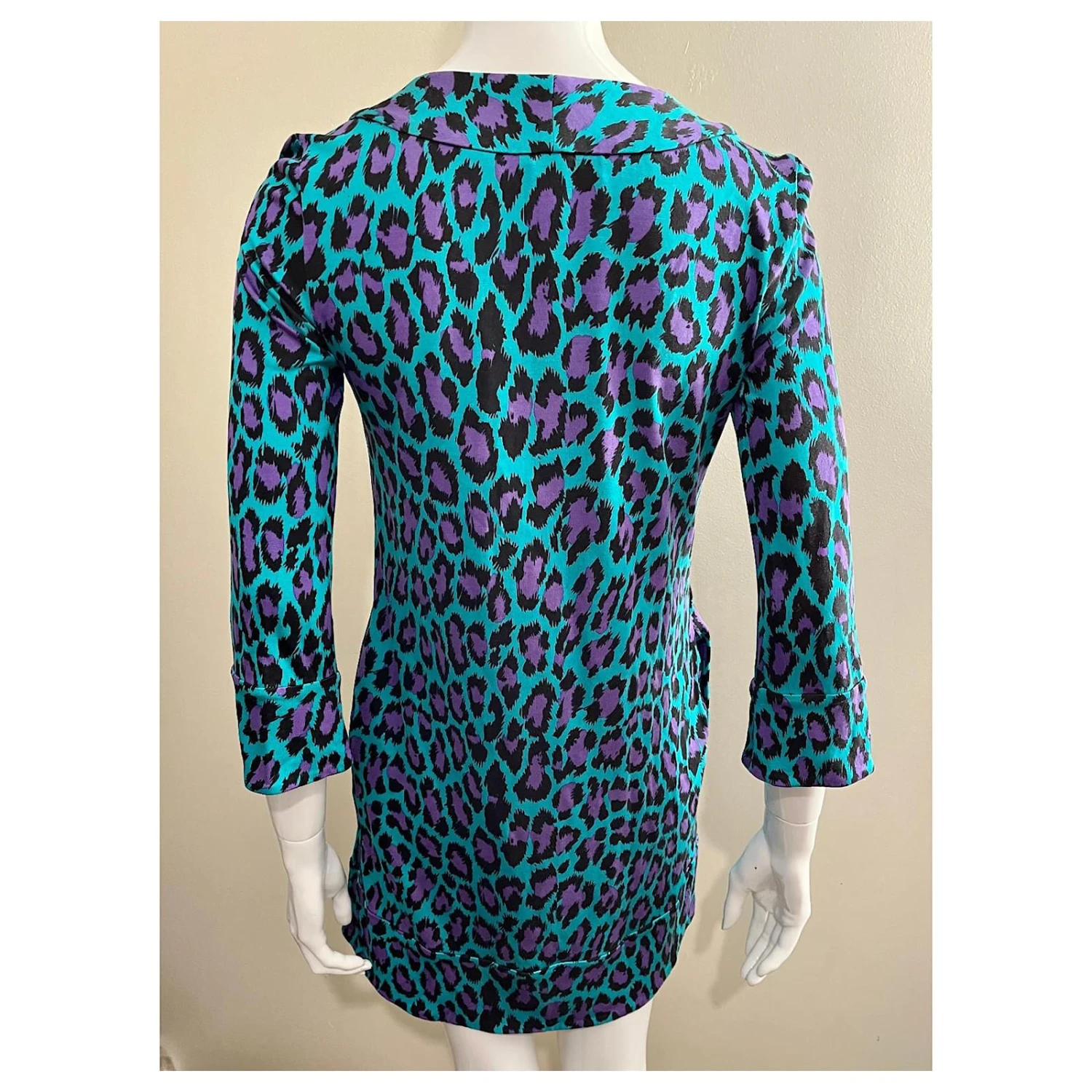 Robe réédition vintage DvF avec motif « Acid Leopard » façon tunique, La taille de la robe est 2 mais il doit s’agir d’un dimensionnement numérique car il est assez grand (comme au Royaume-Uni 10, s’il vous plaît voir les mesures ci-dessous).