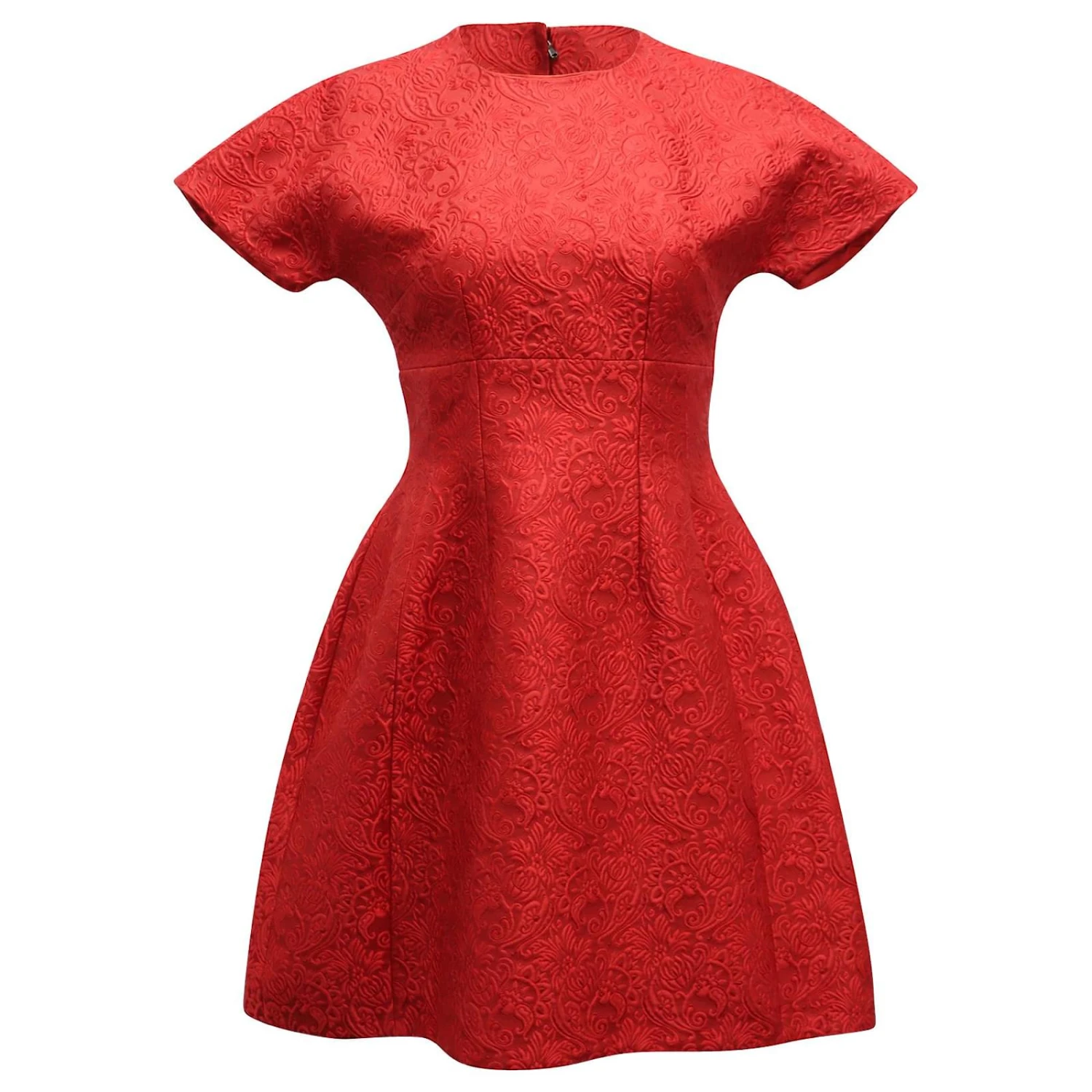Cette incroyable robe en jacquard rouge Dolce & Gabbana de l’automne/L’hiver 2013 Collection de piste. est fait d’un mélange de soie et de coton rouge foncé, robe en brocart fleuri à col rond, manches courtes, un tour de taille défini, une jupe trapèze évasée et une fermeture éclair dissimulée à l’arrière.