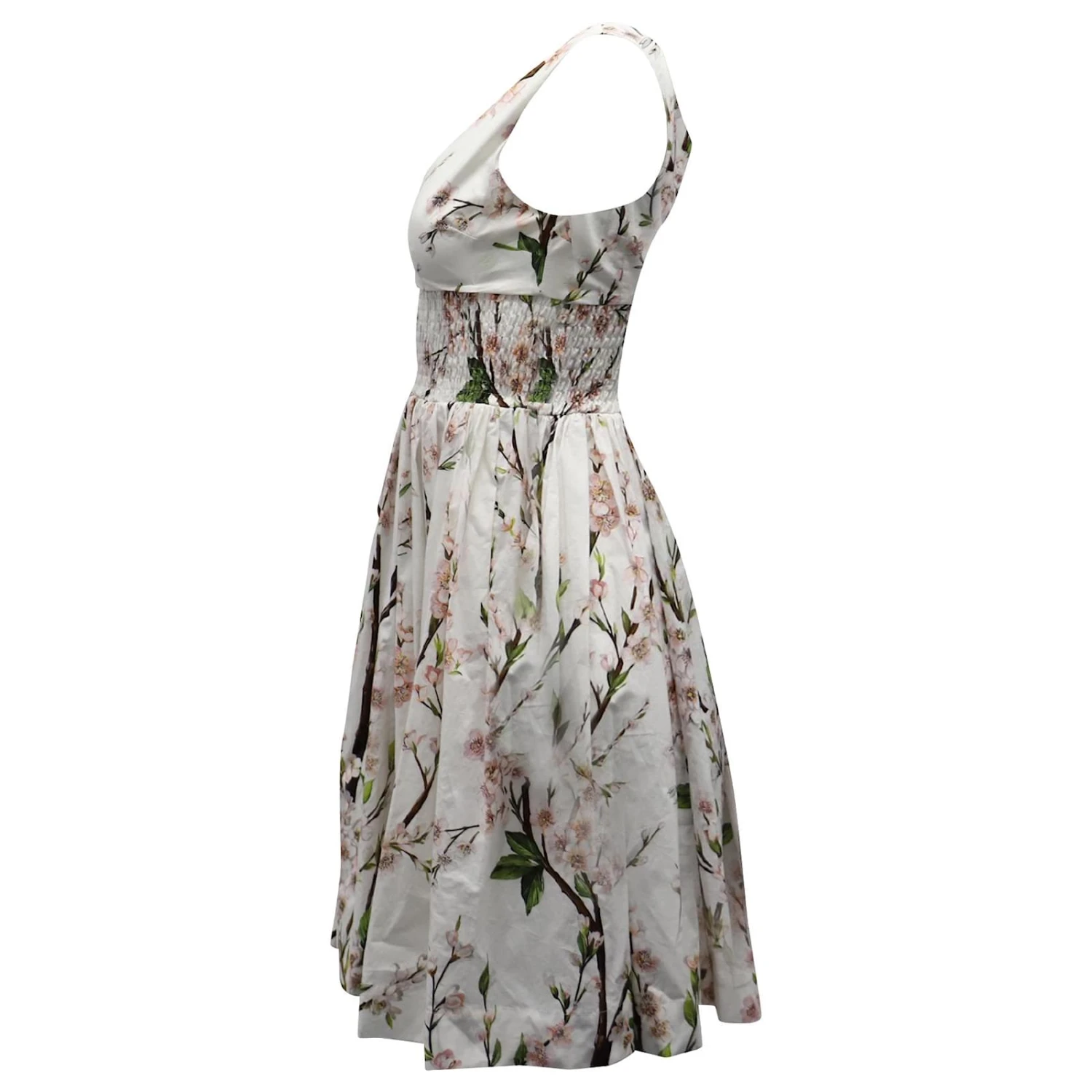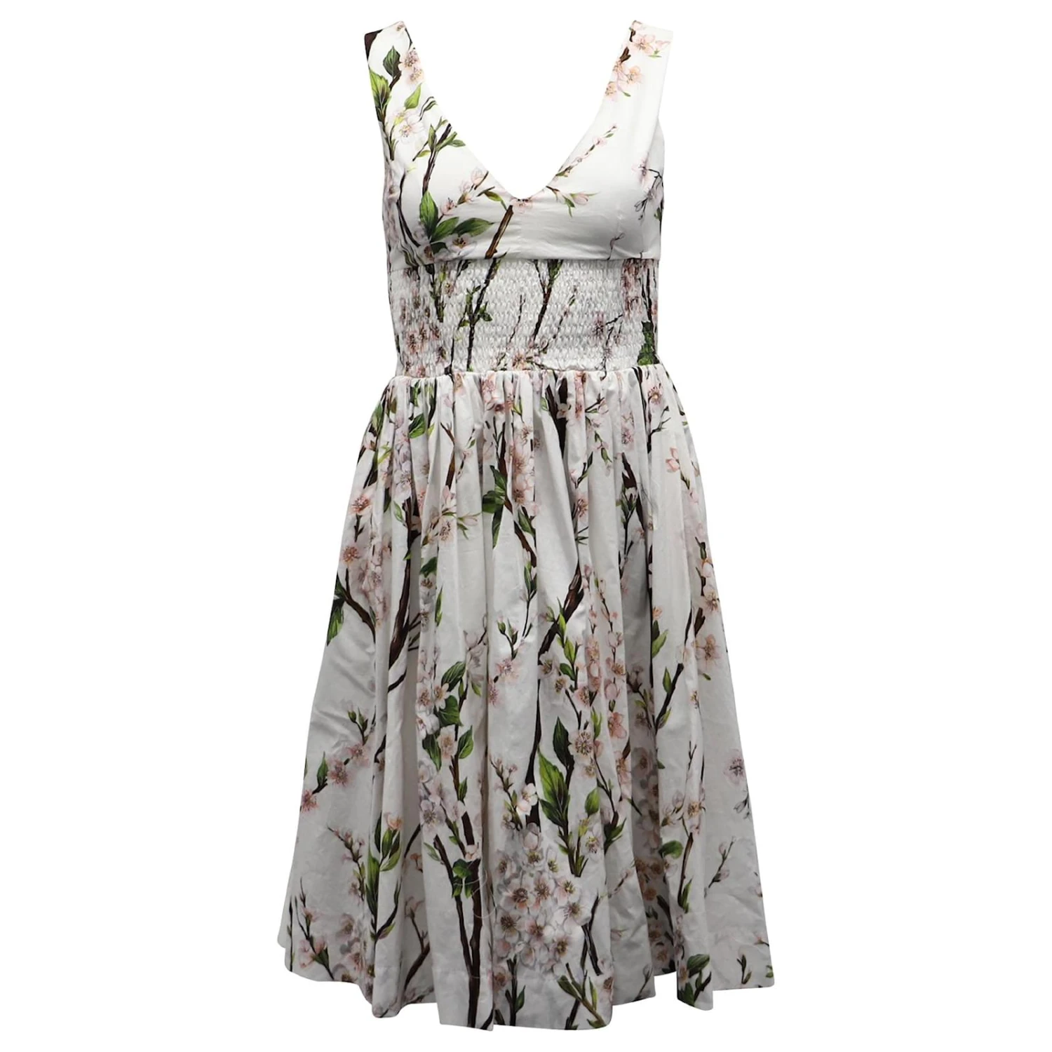 Du printemps 2014 Collection. Blanc, du rose, et robe sans manches Dolce & Gabbana multicolore avec imprimé de fleurs de cerisier partout, Col en v, plissage à la jupe, et fermeture à glissière dissimulée au centre du dos.