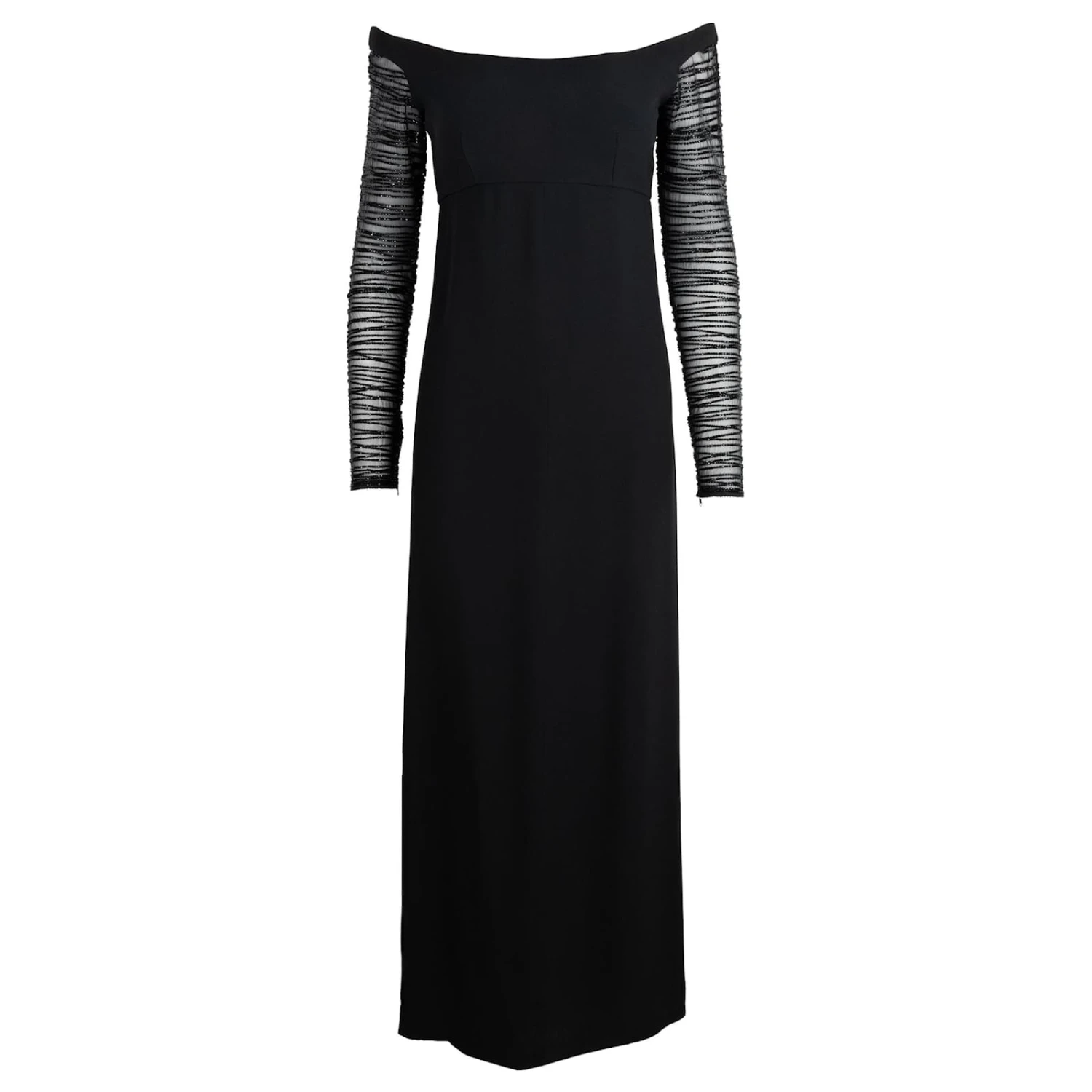 GIANFRANCO FERRE 90Robe noire de entièrement ornée de cristaux tubulaires noirs. Coupe longue avec encolure ronde et manches longues transparentes.