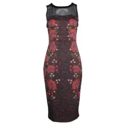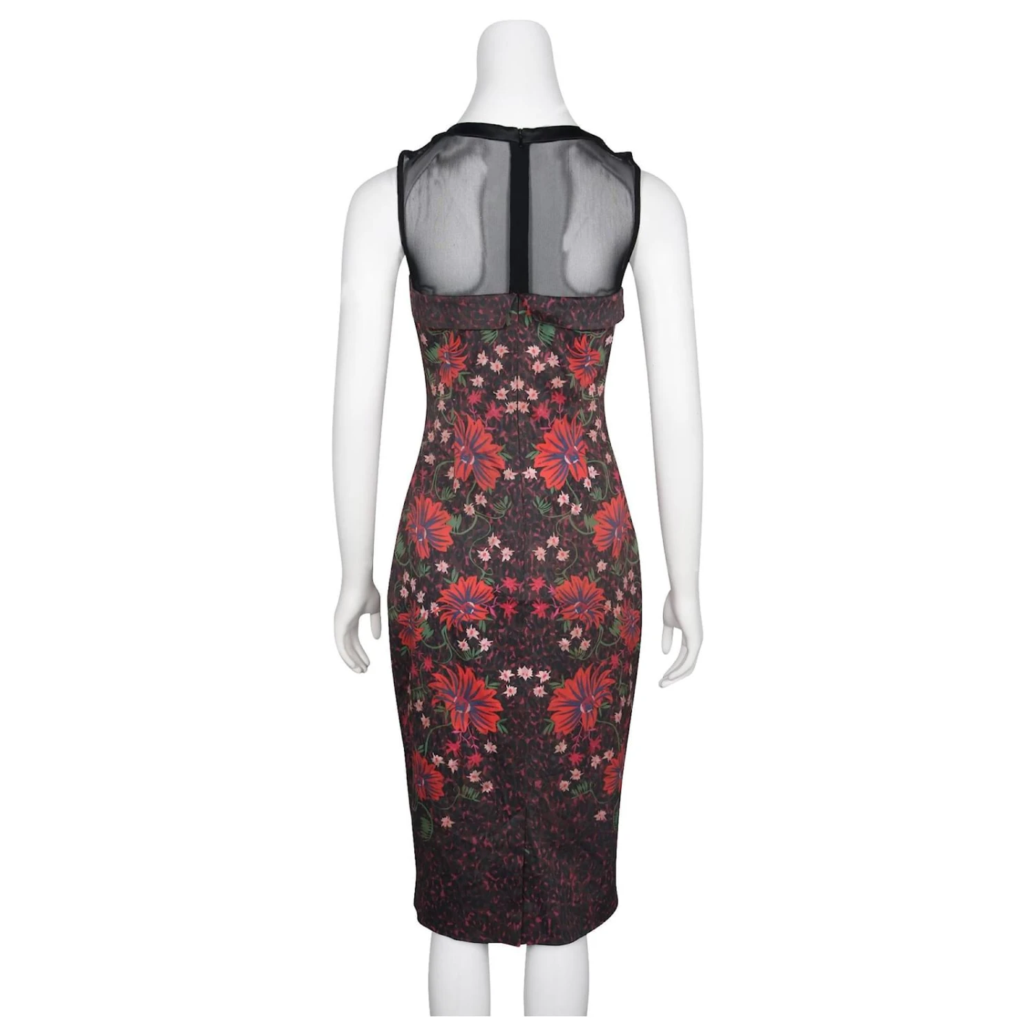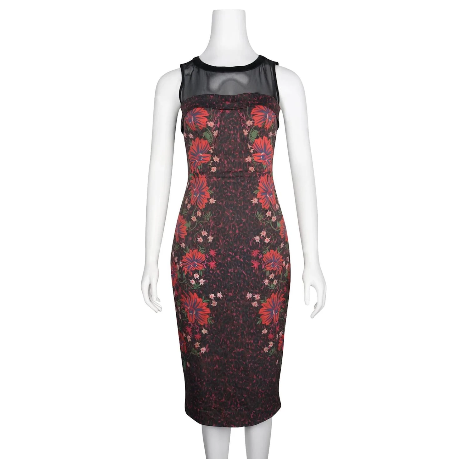 Robe midi sans manches à imprimé fleuri. Top résille noir. fermeture à glissière au dos. en très bon état général. Fabriqué à Chypre.