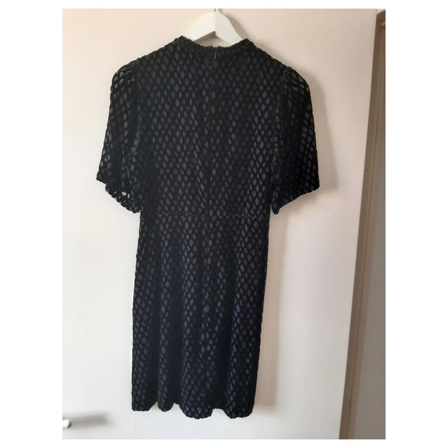 Robe noire en velours moirée à manches courtes, près du corps sans être moulante – taille correctement. Aucun défaut, aucune usure