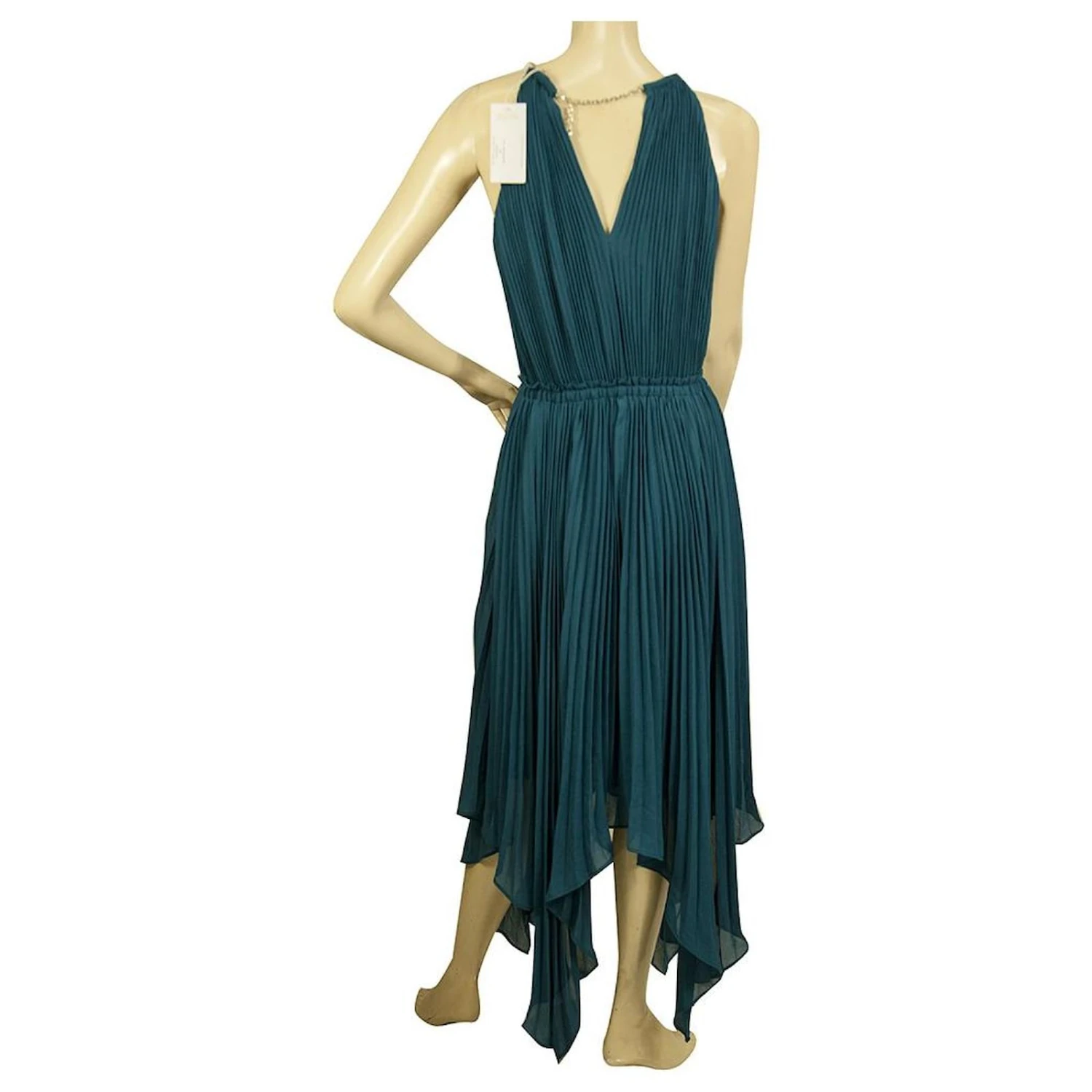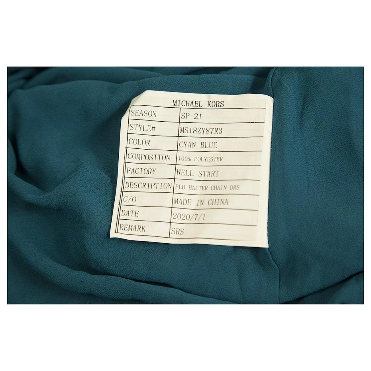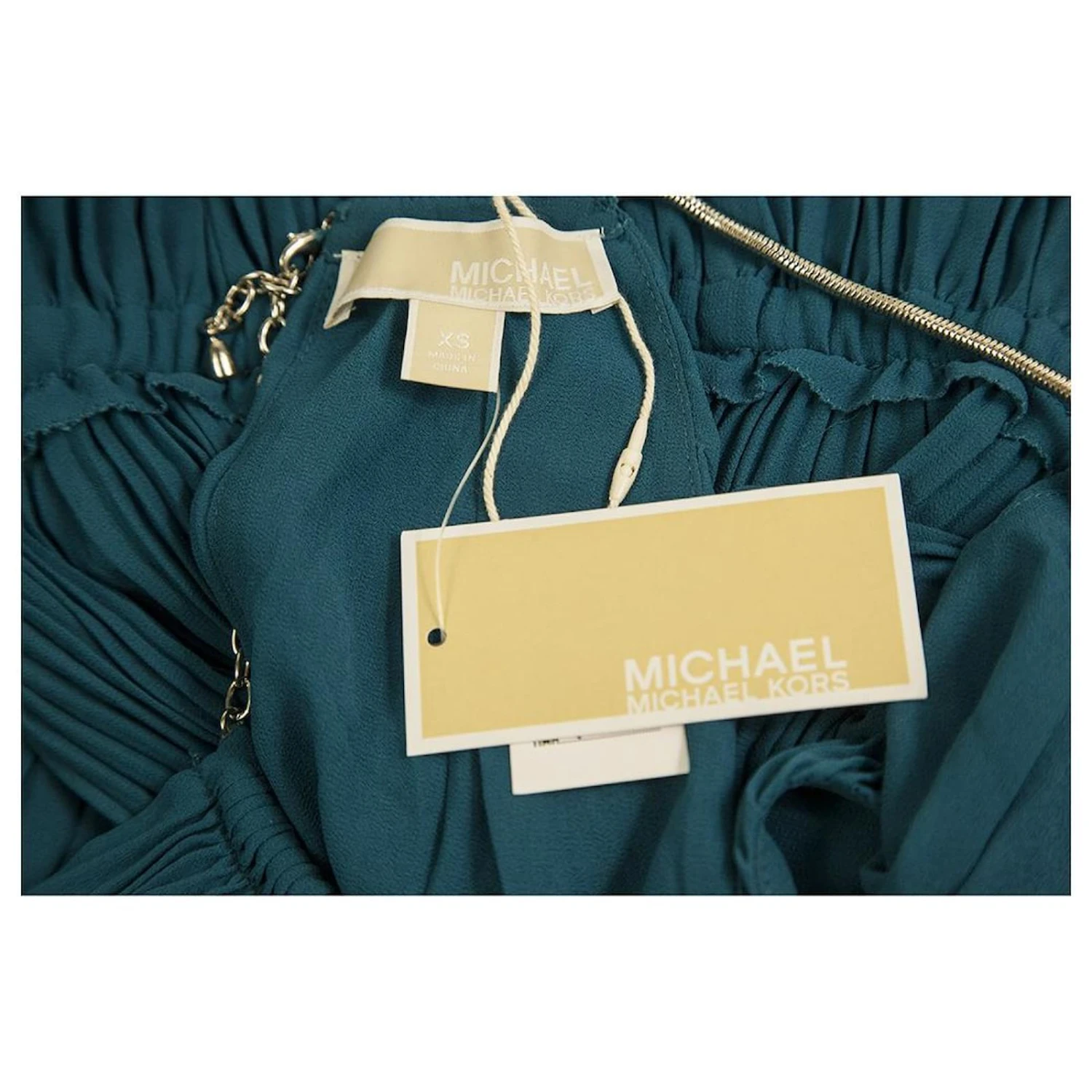 Robe bleue extra impressionnante de Michael Kors, entièrement plissé, avec une belle encolure licou accentuée par une chaîne argentée et une longueur asymétrique pour un look de fête parfait !