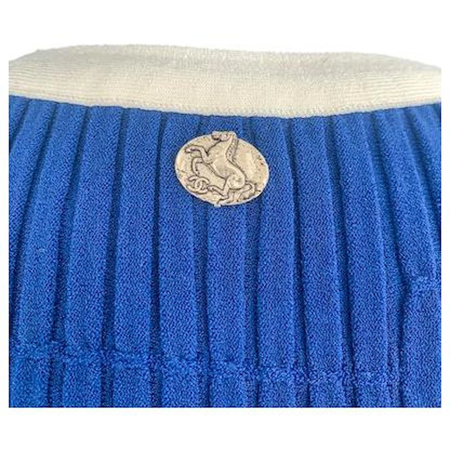 Dans une belle matière plissée, peut s’étendre jusqu’à un 36.Avec une plaque ovale argentée Chanel avec un cheval à l’arrière du cou.cupro, polyestyer, polyamide, élasthane.Longueur épaule à ourlet : 80 cm.Excellent état (9/10). Légères traces d’usure avec légère décoloration du tissu. 2 petites marques au dos, pas perceptible. Quelques petits accrocs dus à la fragilité du tissu.