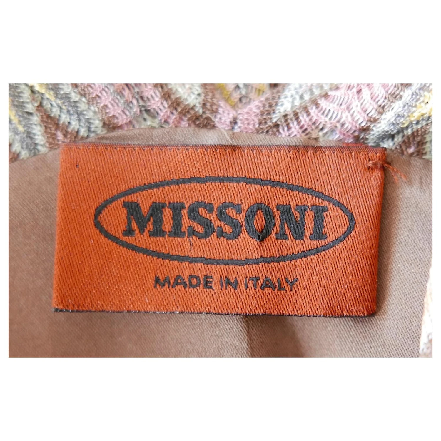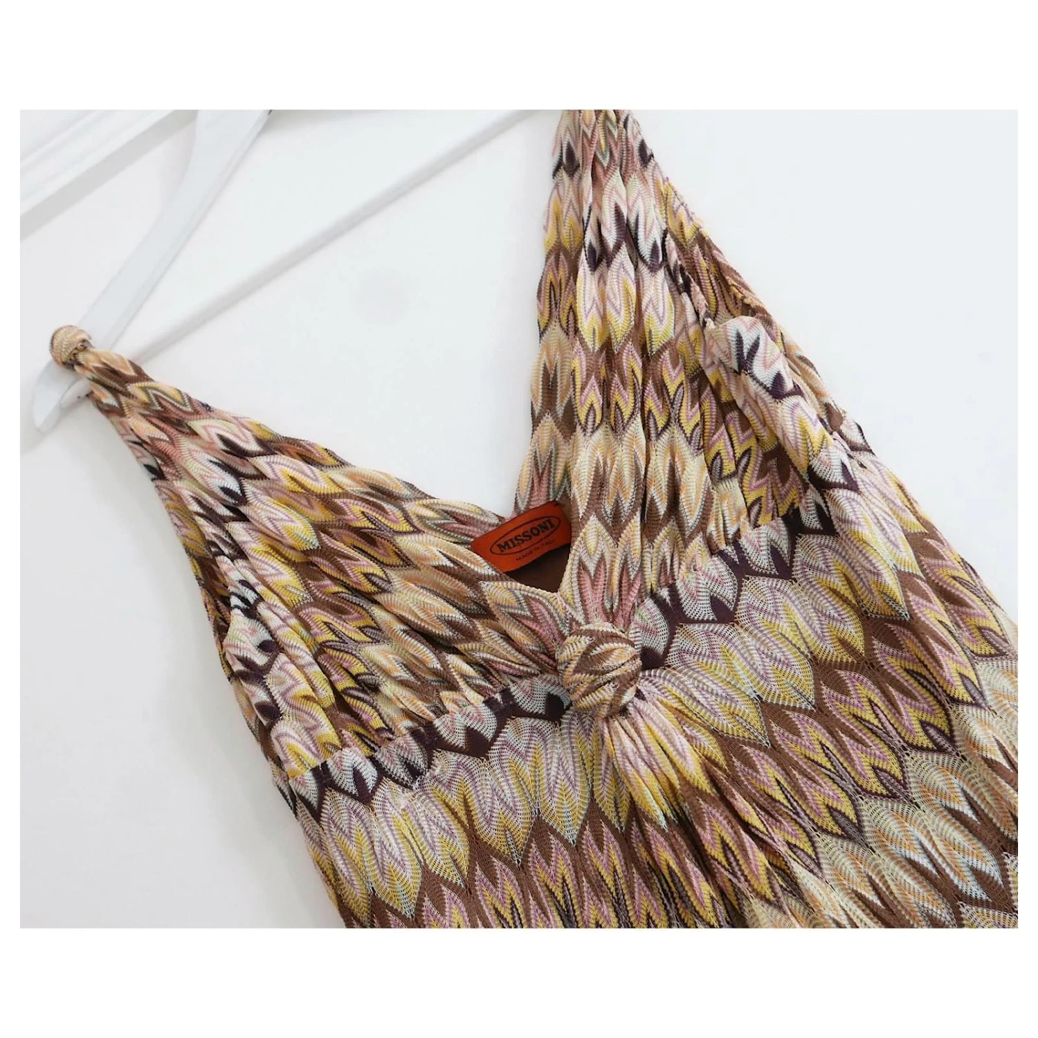 Iconique robe en maille Missoni. Fabriqué à partir d’un doux tricot de rayonne à chevrons zigzag signature avec une doublure en soie et élasthanne marron. il a un 1970coupe maxi inspirée de s avec détails noués et buste empire. A une fermeture éclair sur le côté. Taille IT42/UK10. Mesure environ – buste 34”, hips 40″Et longueur 59”. Léger frottement superficiel sur la doublure à l’arrière