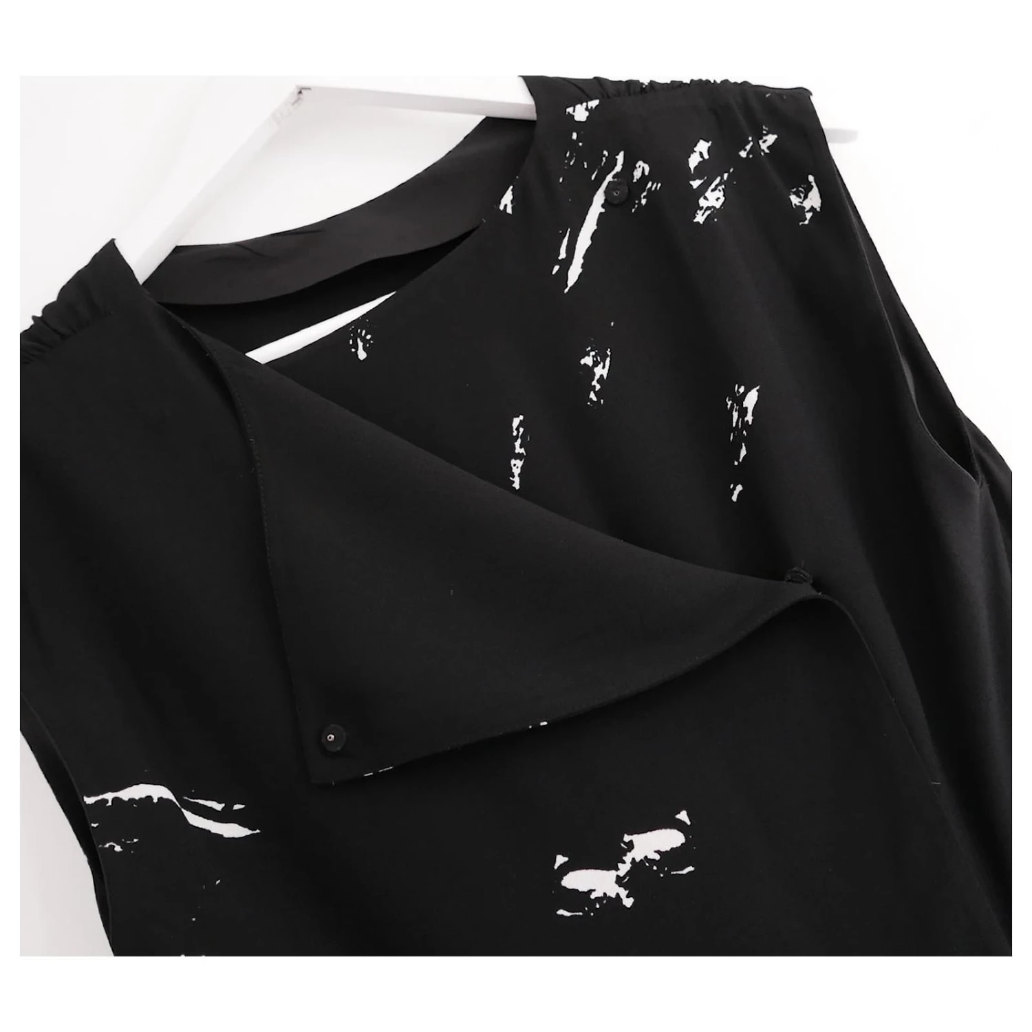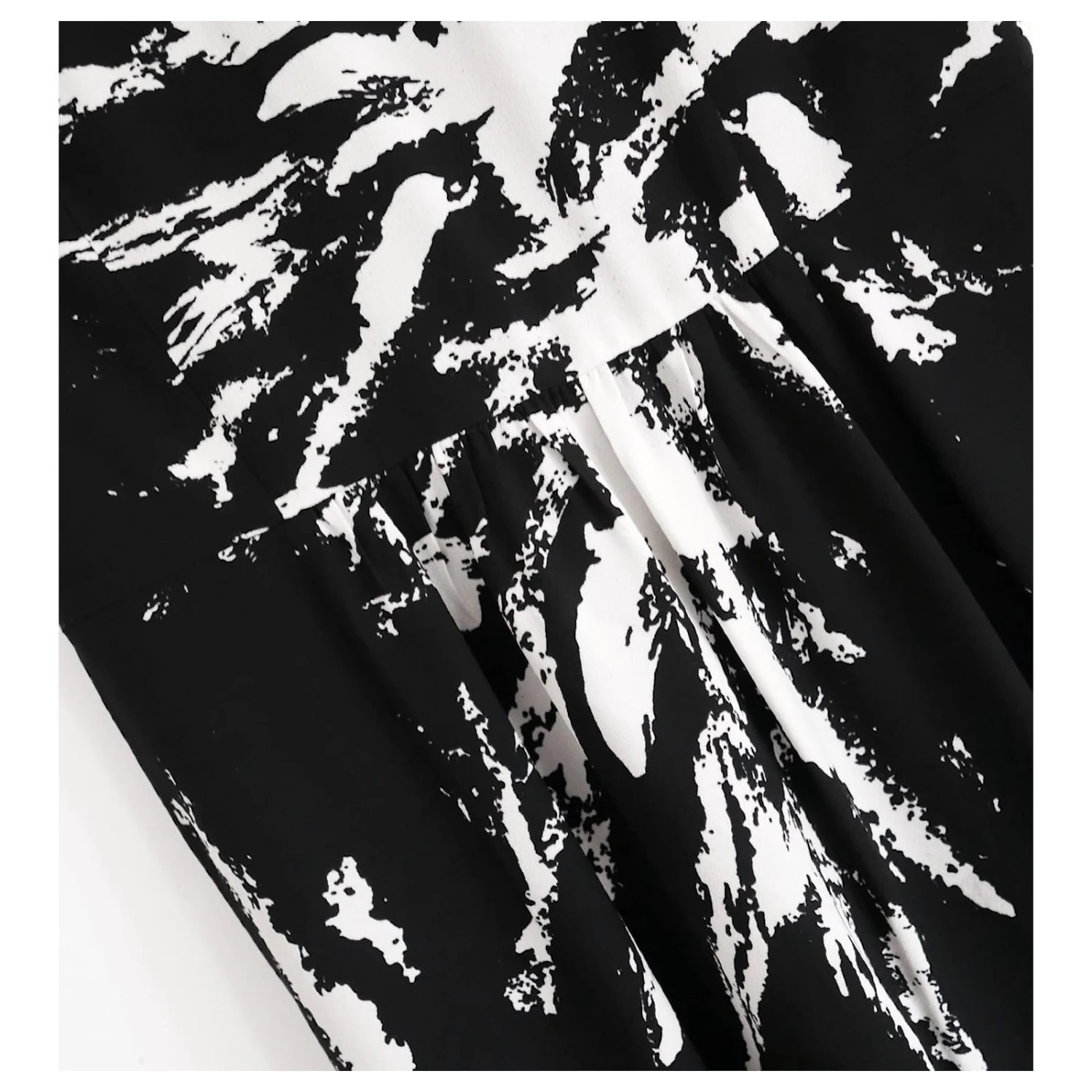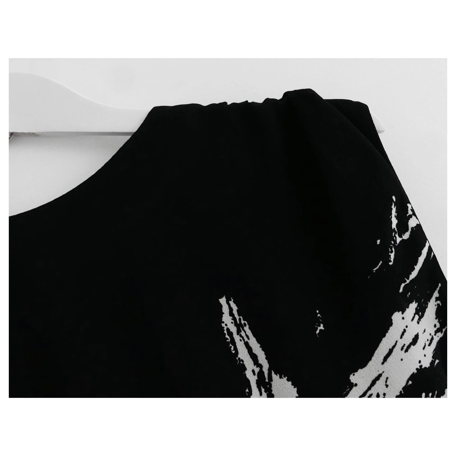 En crêpe de viscose mélangée noir doux avec un imprimé tie-dye feu d’artifice blanc.