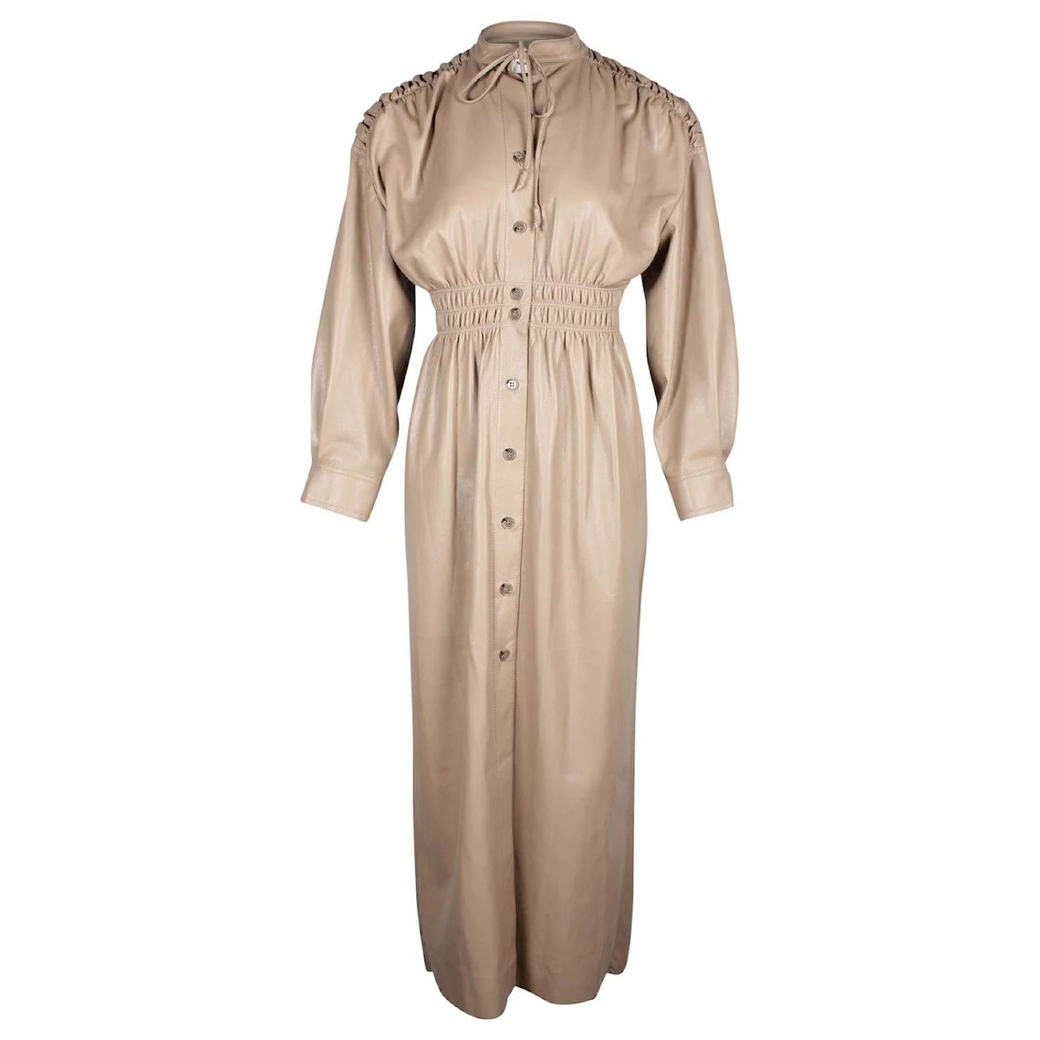 Soyez à la mode dans cette fabuleuse robe midi de Nanushka. Il est magnifiquement cousu à partir de cuir végétalien beige, avec des manches froncées accentuant le flatteur, conception élégante. La fermeture à boutons termine cette création artistique.
