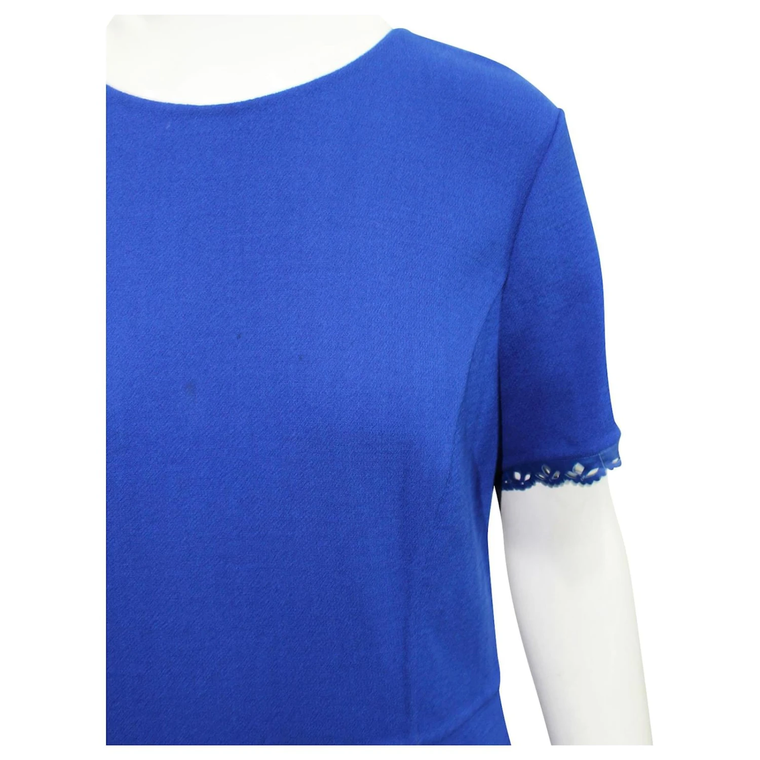 made in Italy, Couleur bleu vif, Matière epaisse, broderie découpée au laser, fermeture éclair invisible dans le dos. Tache de points à peine visible sur la poitrine montrée sur la photo (amovible).