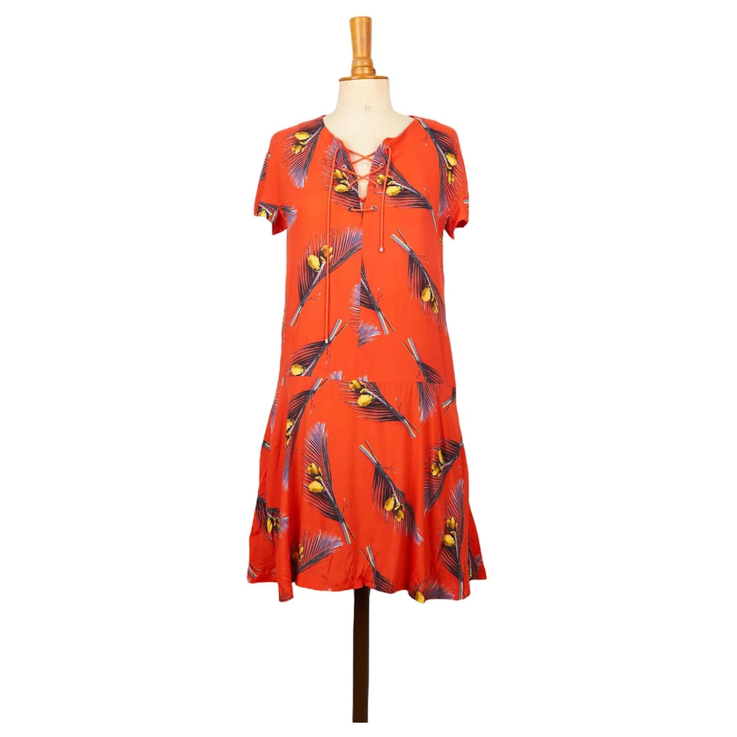 Robe – Cacharel – Robe mi-longue imprimés fleuris – Poches au niveau de la taille – Fermeture zip à l’arrière et cordon sur la poitrine – Rouge – Taille S – 100% Polyester – Très Bon État – Référence 1073005