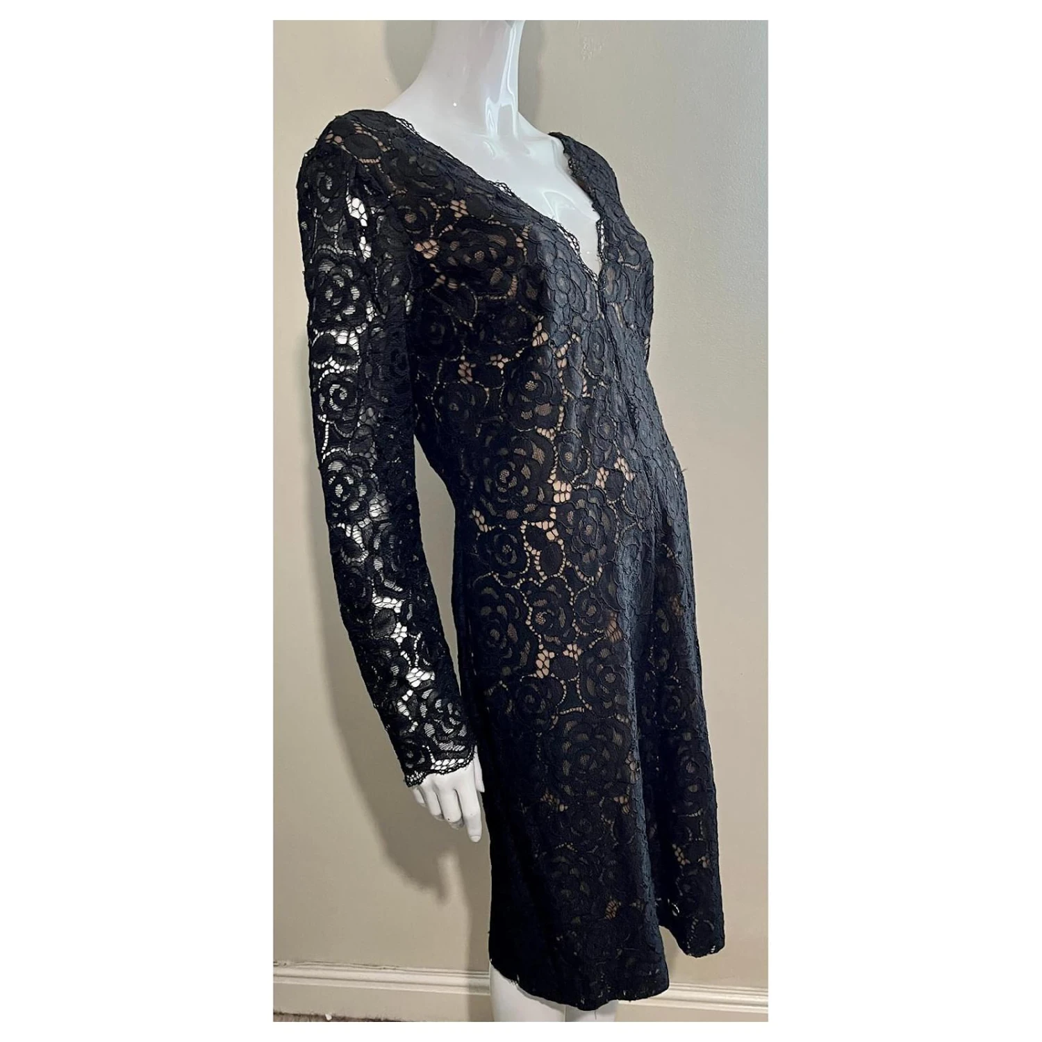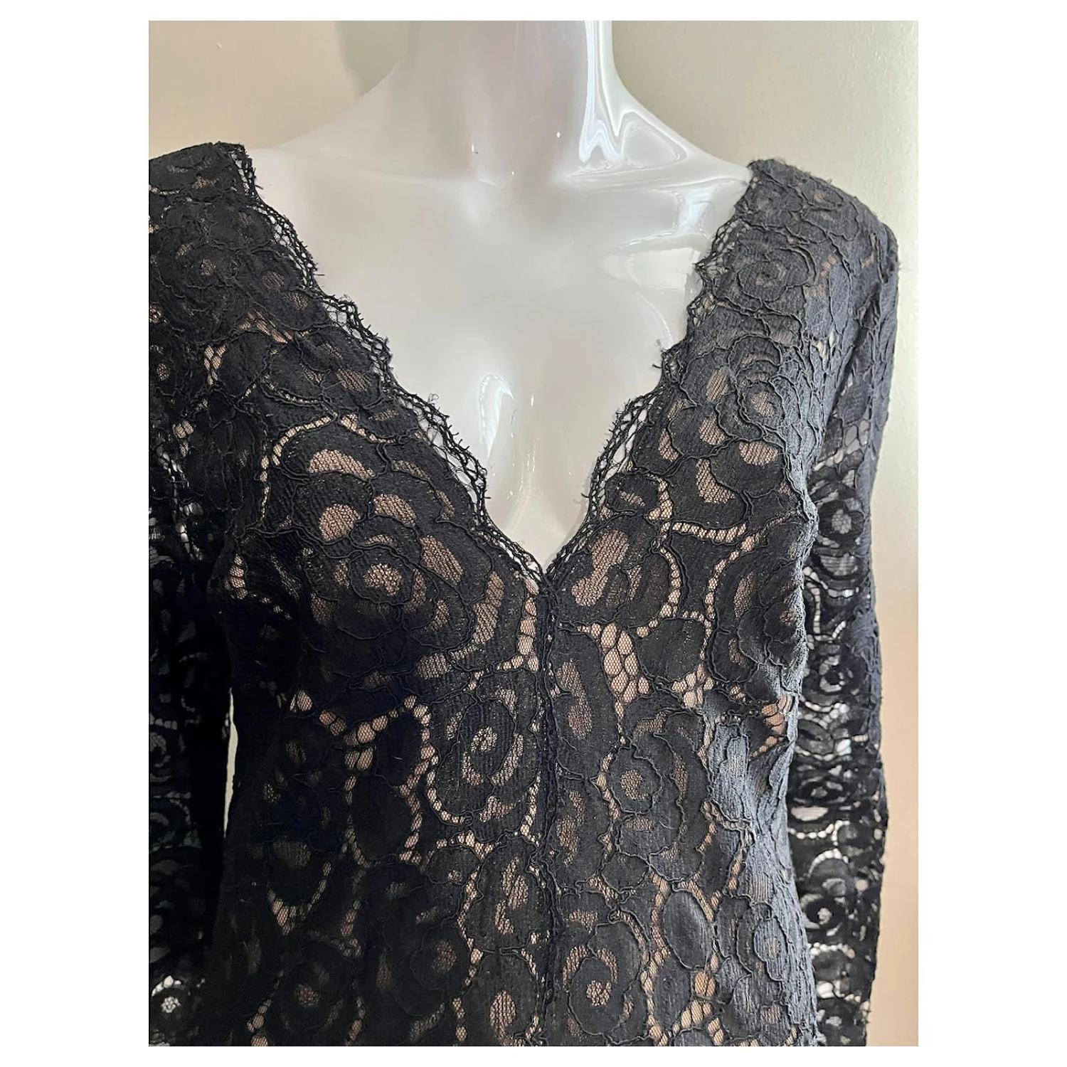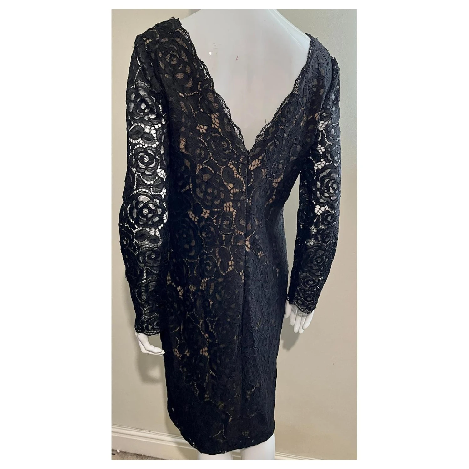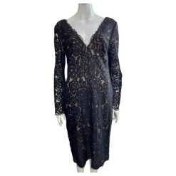 Superbe robe en dentelle illusion par Vera Wang, les manches sont en dentelle transparente, le corps de la robe est doublé d’une doublure couleur peau pour créer un effet lingerie sans être révélateur. La robe a un col en V dans le dos et sur le devant et se ferme avec une fermeture éclair dissimulée à l’arrière.
