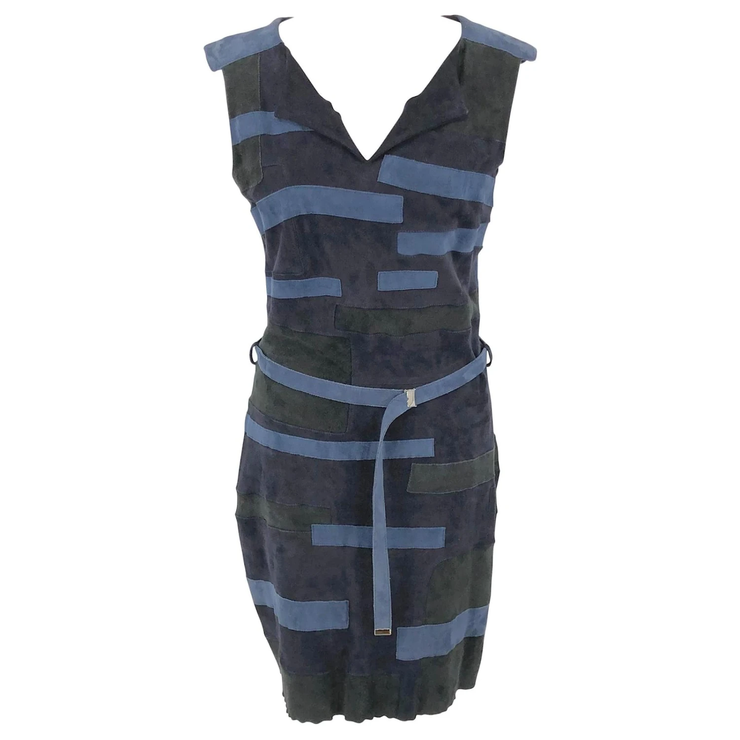 size 42 français.& nbsp;Robe courte en daim stretch marine avec patchwork bleu bleuet et noir. Il a un col en V, manches courtes et ceinture bleue amovible avec boucle argentée. Le dos de la robe a aussi un patwork mais majoritairement en marine et noir.zippé à l’arrière.Non doublé.En tissu: 100% peau d’agneau, 97% cotton, 3% Lycra.Longueur épaule à ourlet : 89cm.