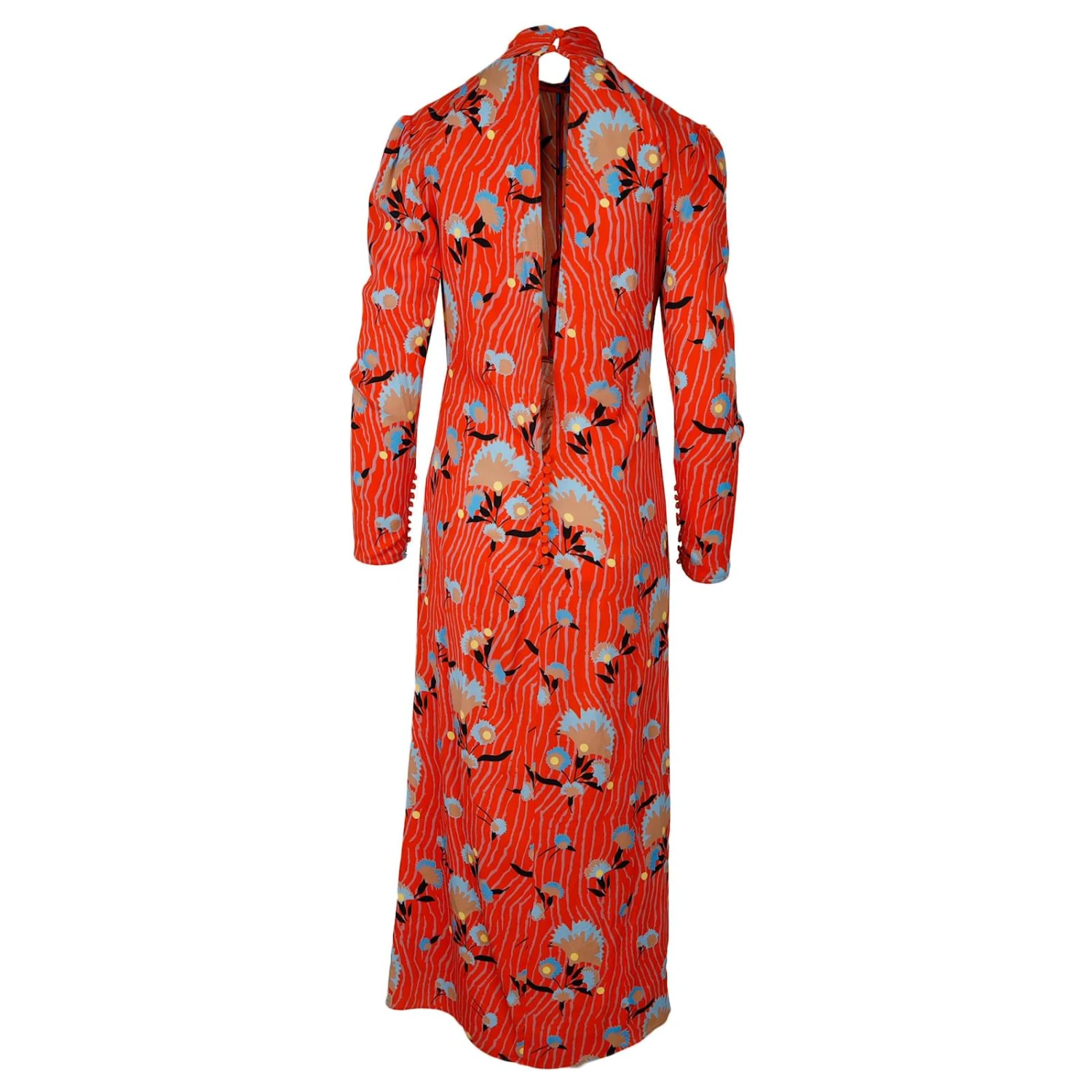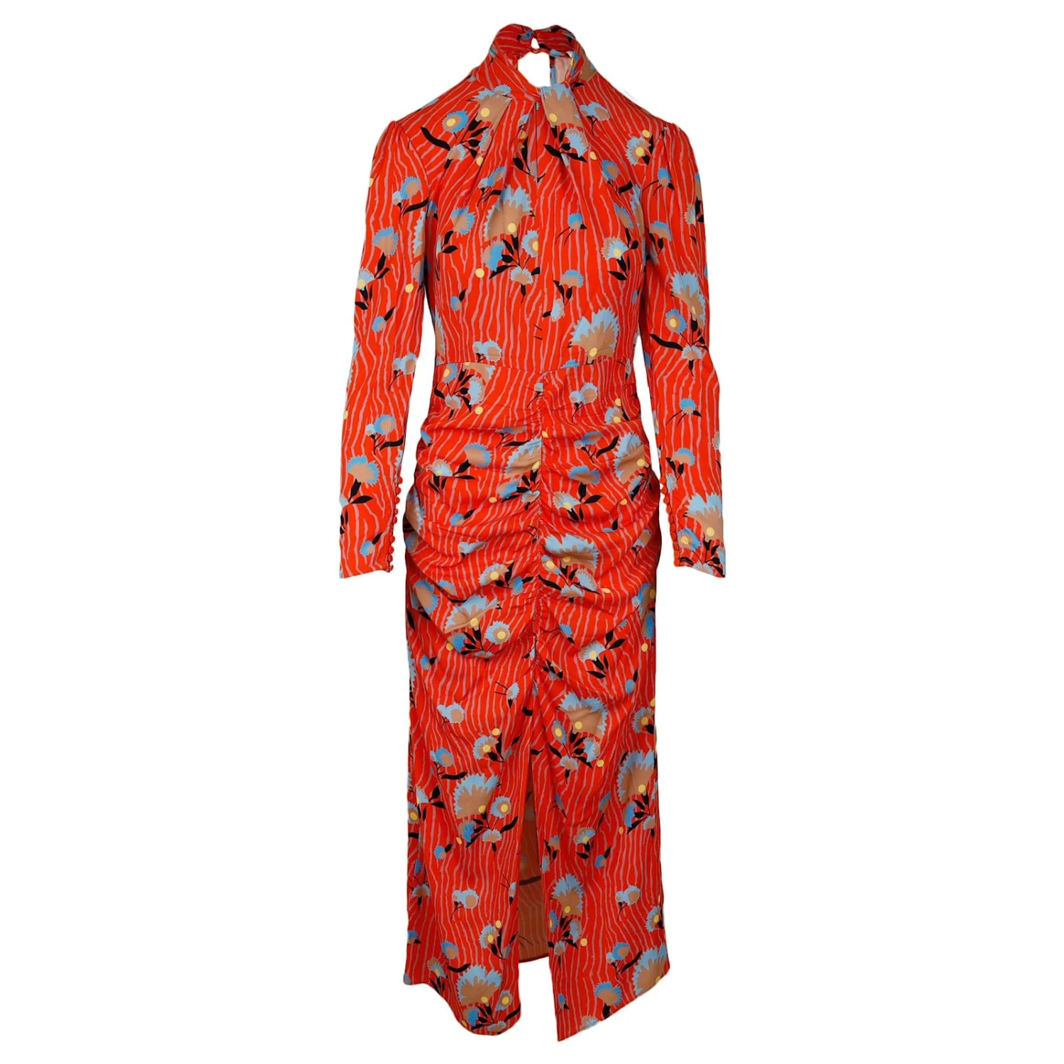 fabriqué en 2019, cette robe mi-longue en crêpe à imprimé botanique Self Portrait présente un col fermé, une fente devant à l’ourlet, et une coupe étroite et raide laissant un léger aperçu de l’arrière. L’élément remarquable qui se démarque dans cette robe est la diversité des techniques de couture qui créent le froncement du haut plissé et les plis accroupis au-dessus de la fente..