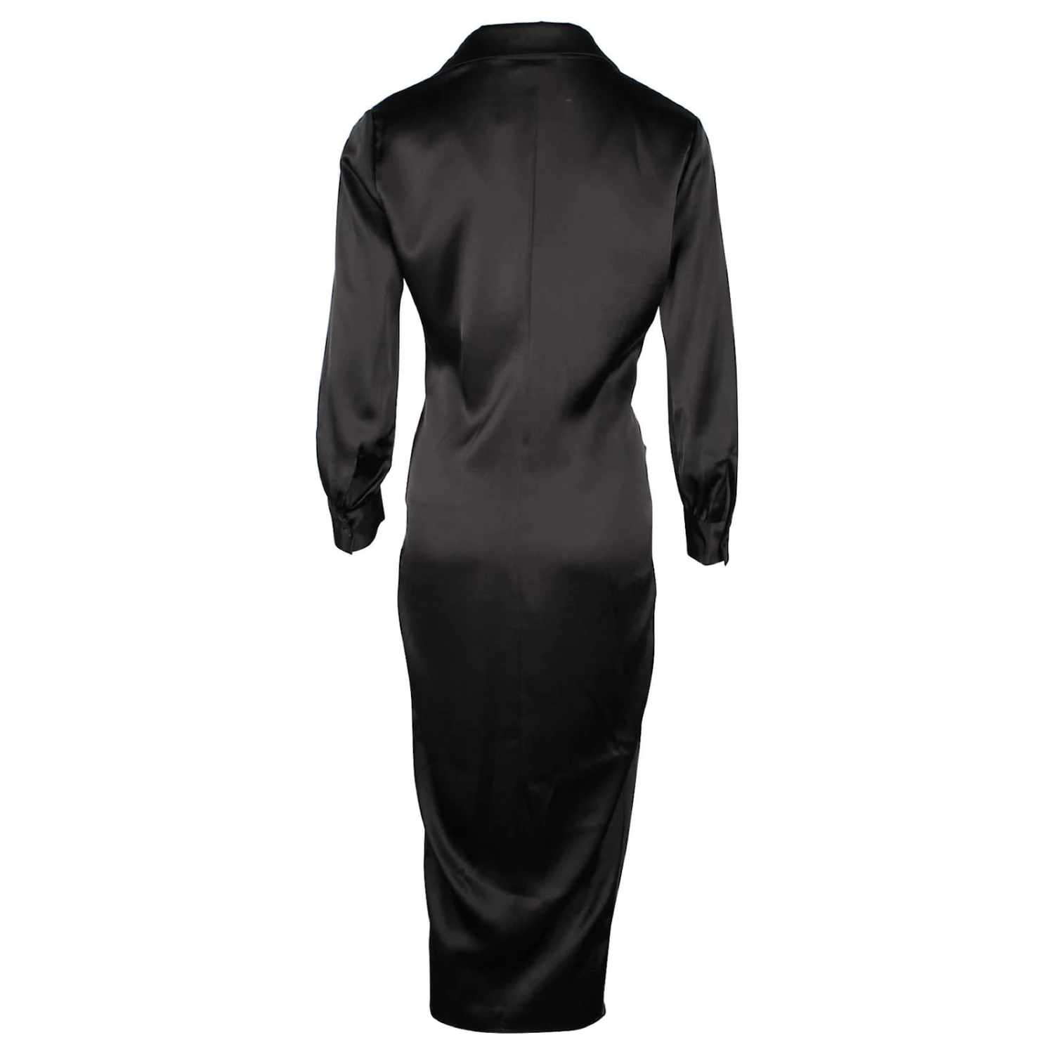 Cette robe mi-longue est conçue avec un col en pointe, Décolleté en V, poignets boutonnés, et un détail de torsion. Coupé à partir de triacétate avec une finition brillante et luxueuse, Texture douce, ce style sophistiqué est parfait pour les occasions spéciales.