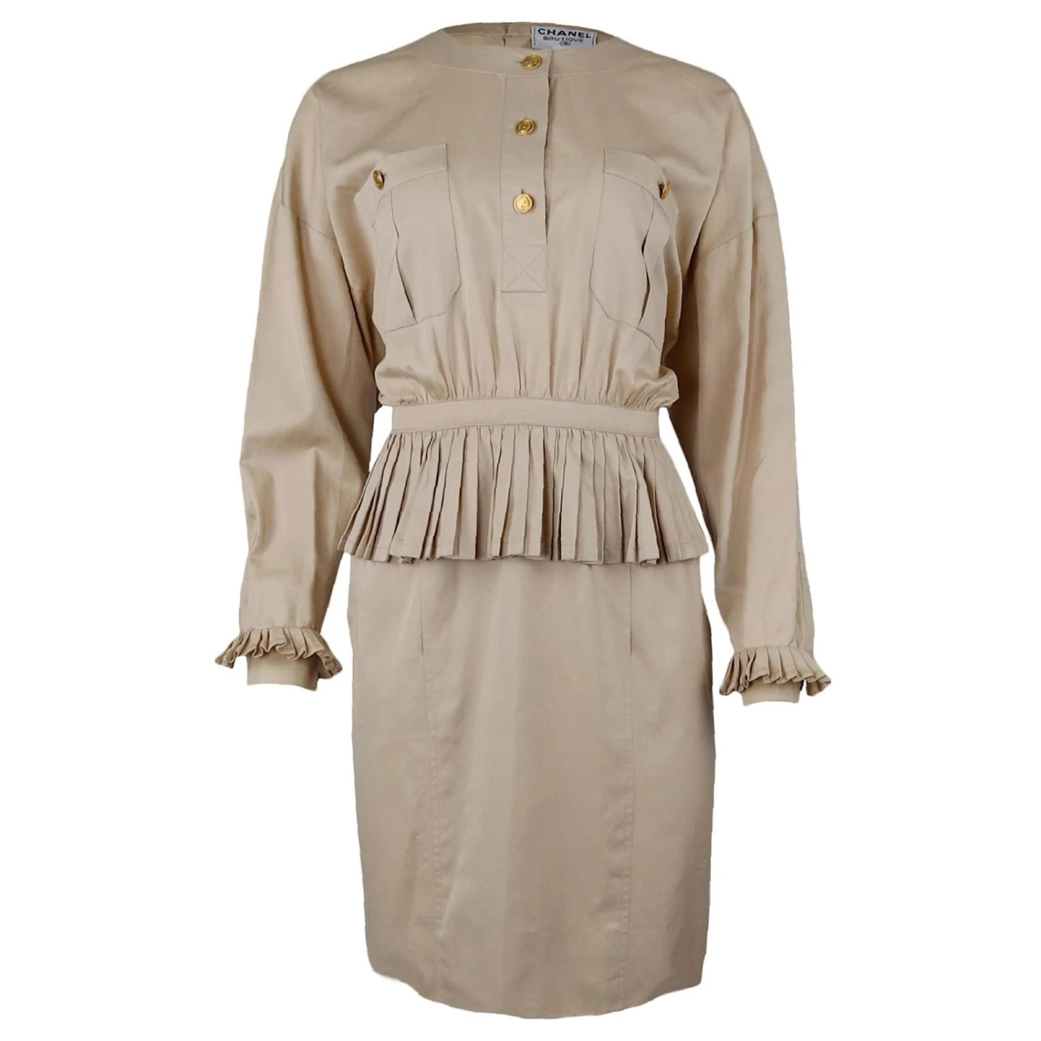 Embrassez le quotidien ’80c’est la mode avec ça 1986 Robe plissée crème Chanel ornée de boutons dorés Coco Chanel. Outre des détails polyvalents tels que deux poches sécurisées par des boutons, c’est le savoir-faire unique tel que les volants plissés au poignet et à la taille qui mettent en valeur la silhouette féminine qui en fait une pièce unique.