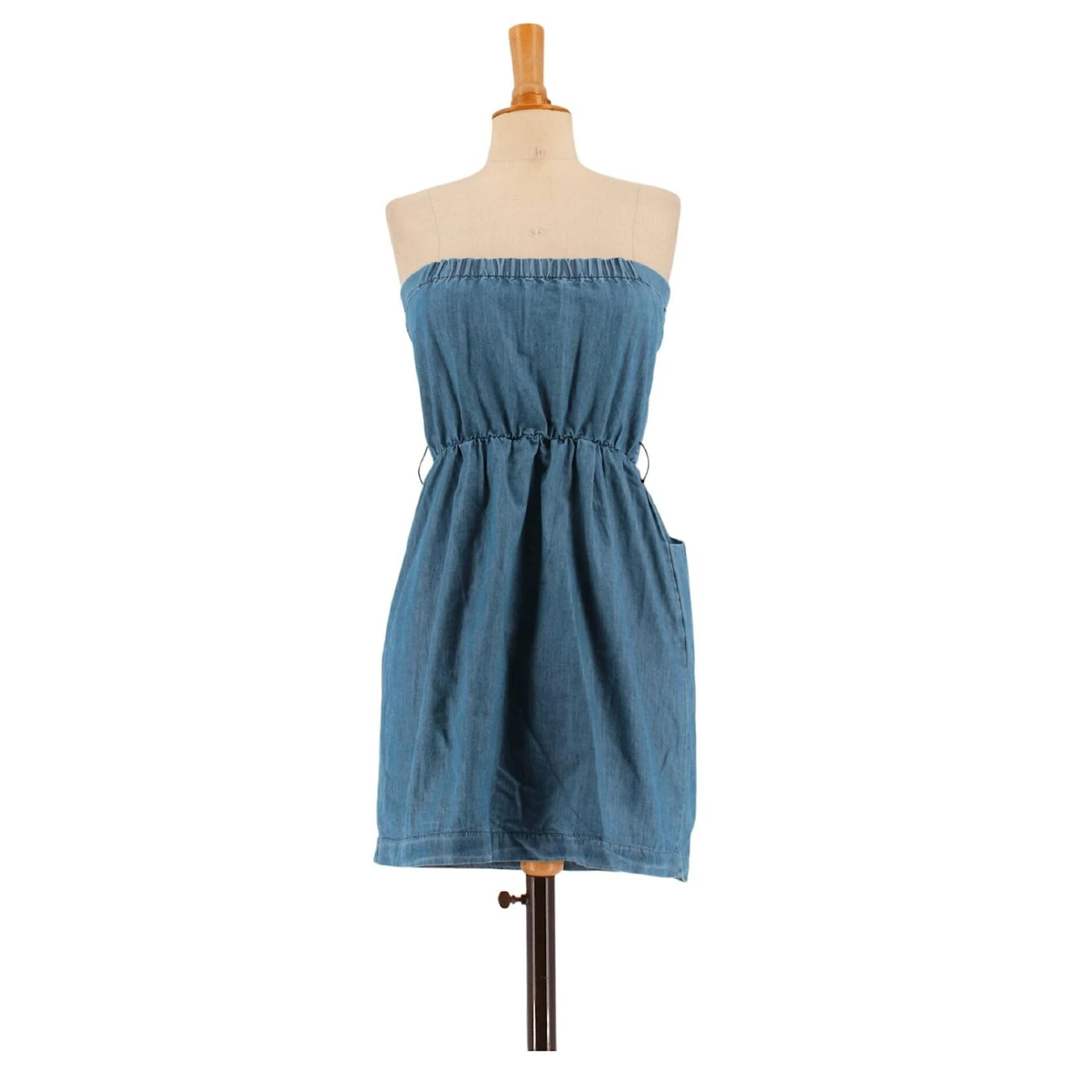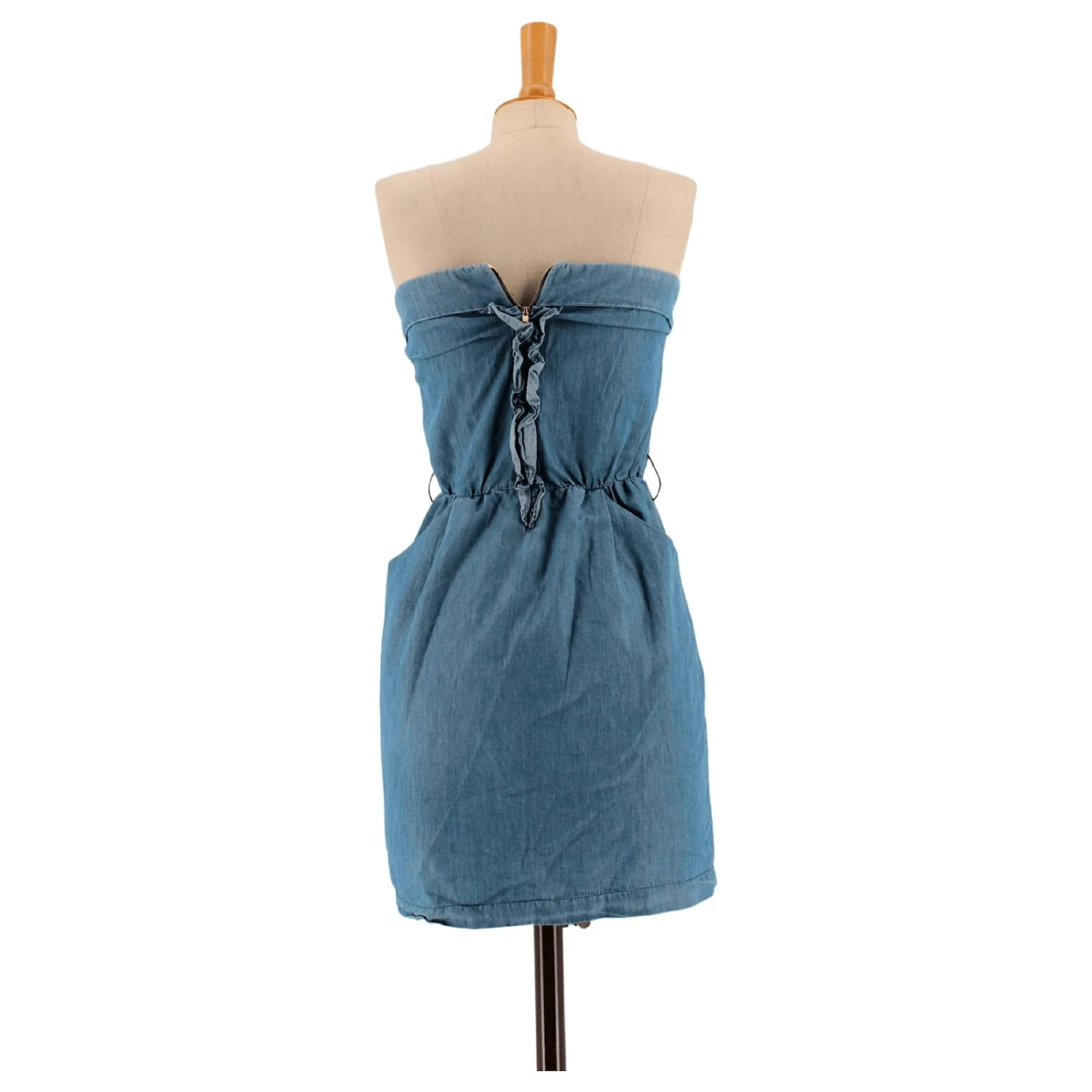 Robe – Sandro – Robe bustier – Elastique à la taille et dans le dos – Fermeture éclair sur le devant avec détails froncés – Bleu – Taille S – 100% Coton – Très Bon État – Référence 1005001
