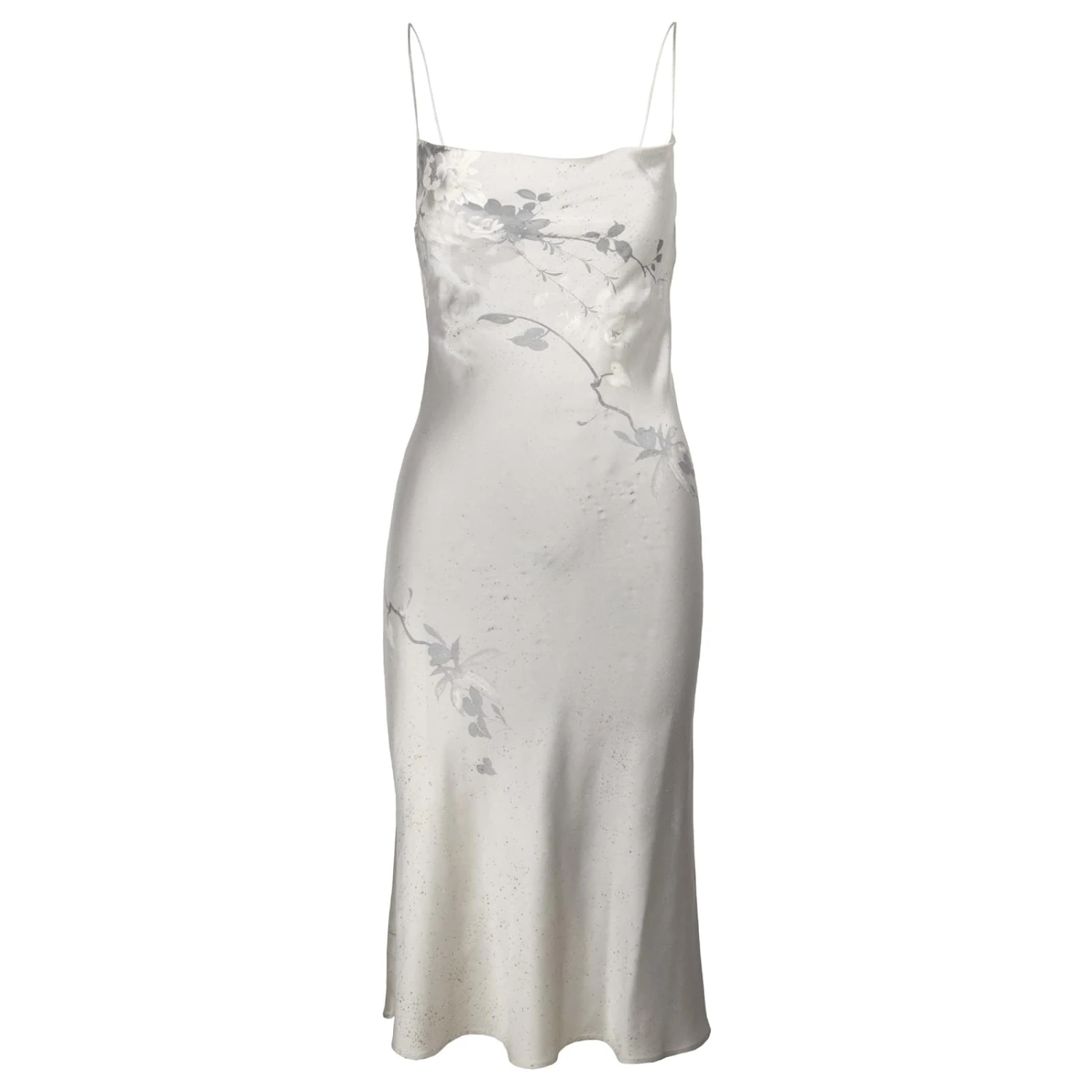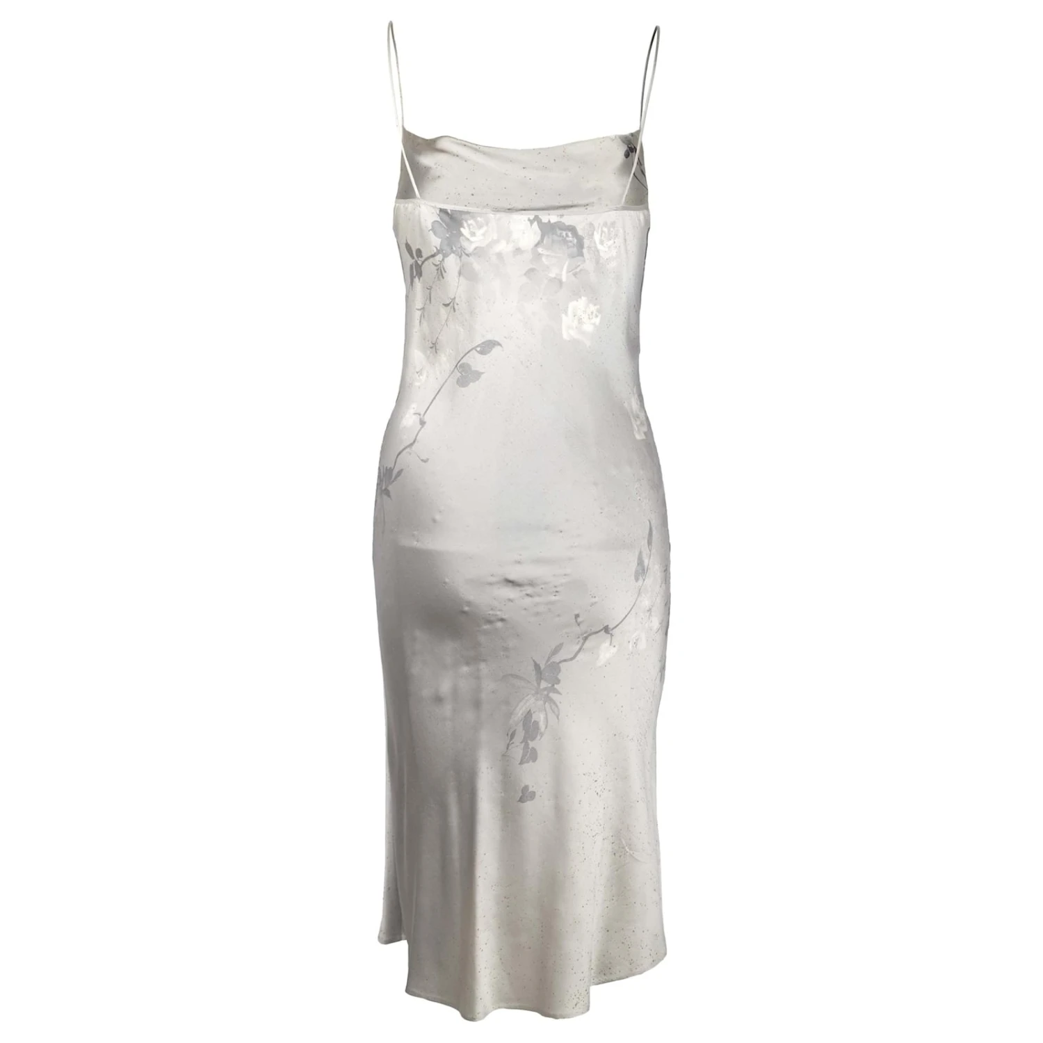 Robe nuisette Roberto Cavalli en soie à bretelles spaghetti. La robe présente un motif floral complexe et des détails scintillants argentés.