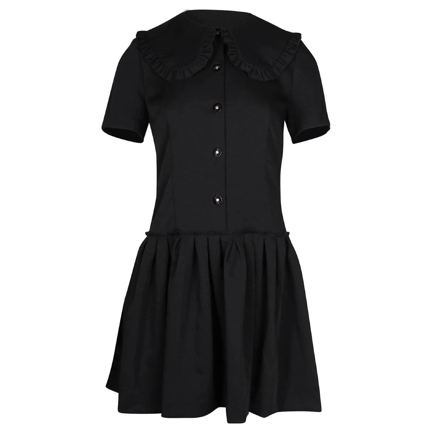 Une touche moderne au col classique Peter Pan, cette mini robe est confectionnée dans un sergé plissé léger et doux. Les fronces à la taille et la jupe évasée créent un volume féminin autour de votre silhouette, tandis que la fermeture boutonnée centrale unique sur le devant assure une finition extra glamour.