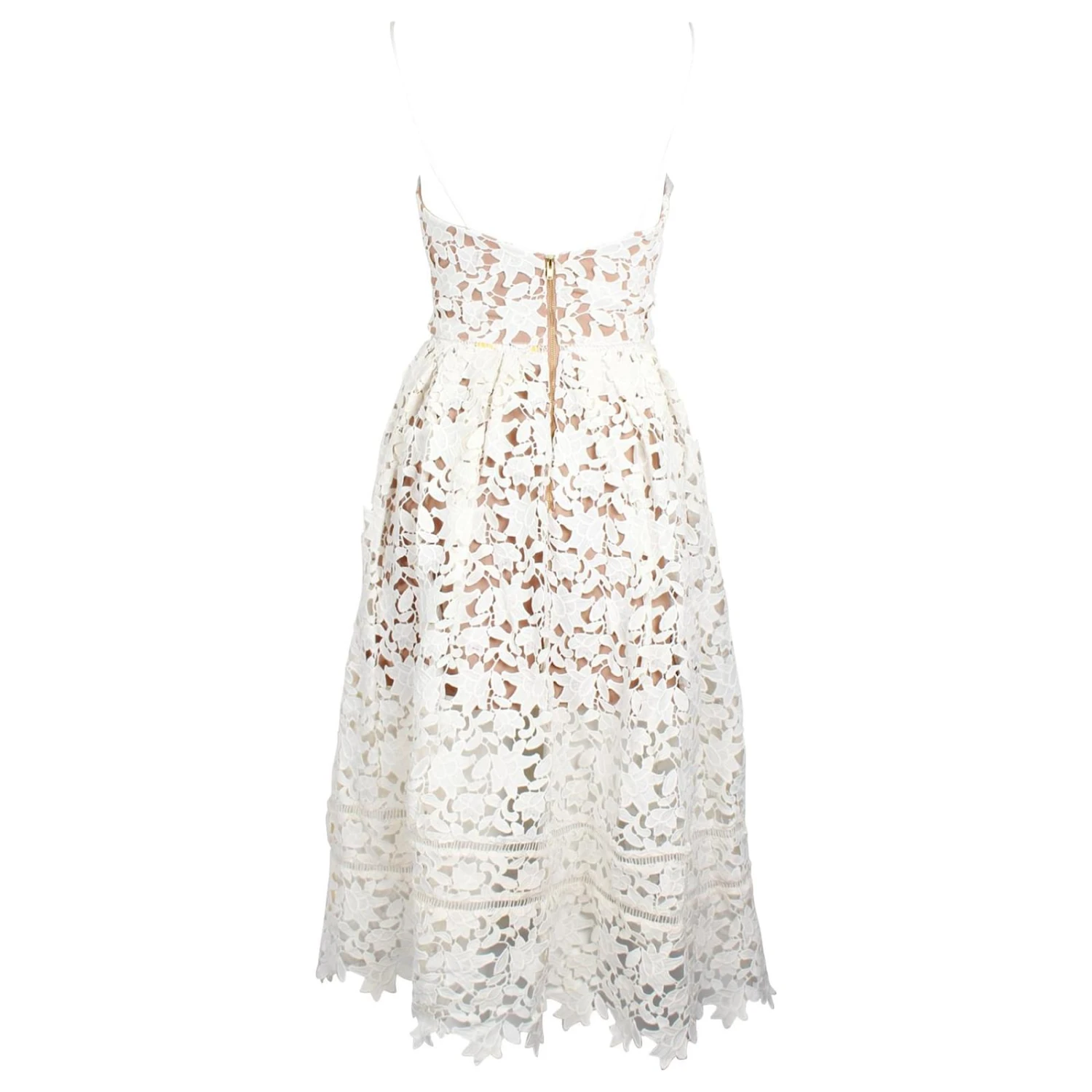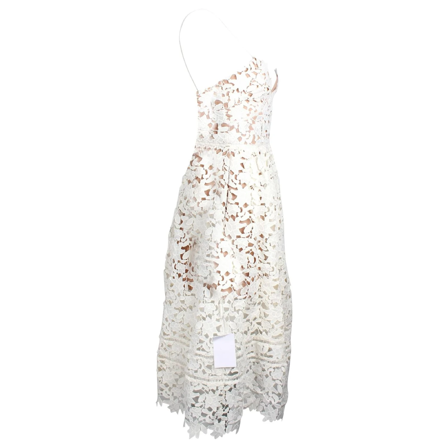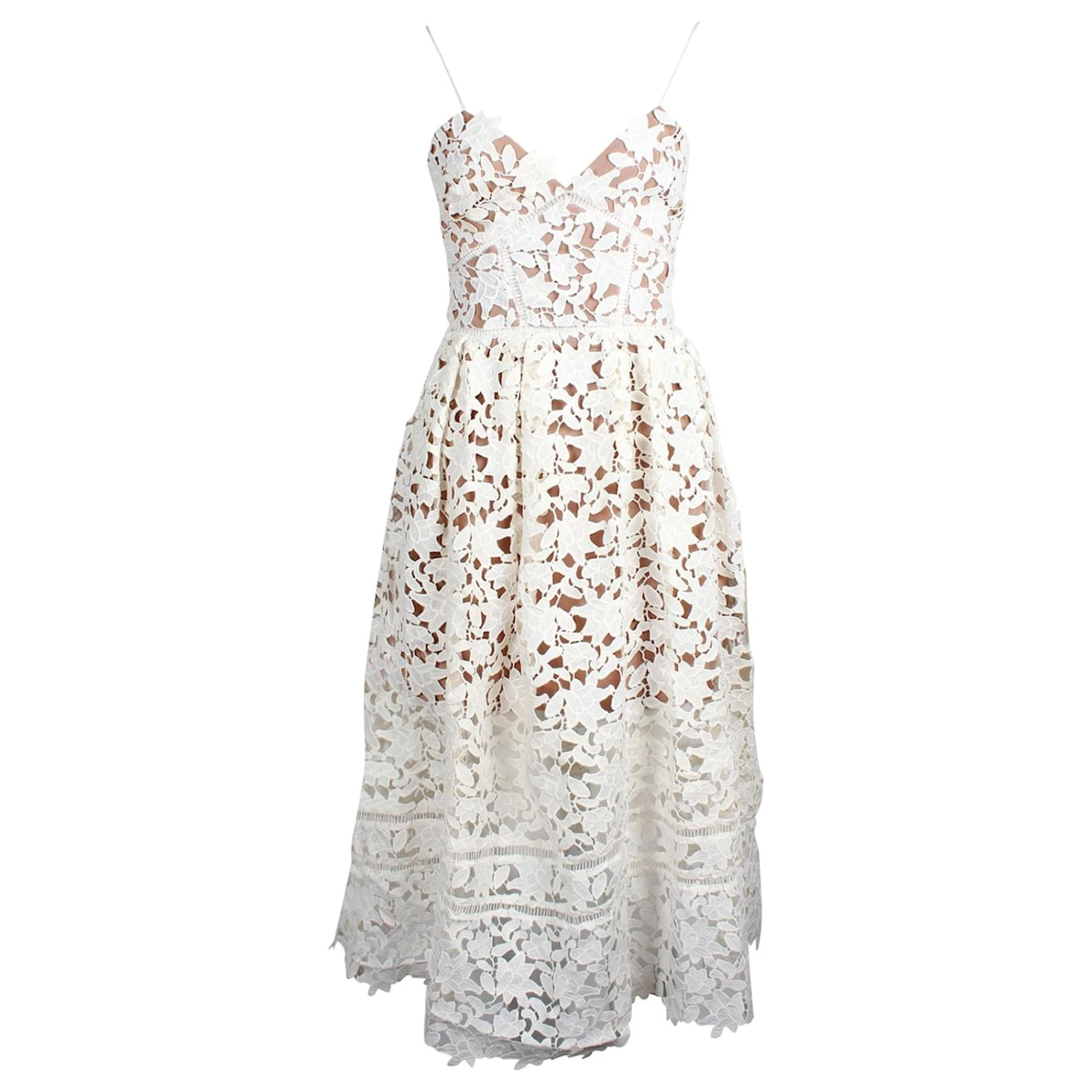 Arrivant dans une silhouette signature de l’étiquette, cette robe midi de Self Portrait imprègne la féminité intemporelle. Savamment confectionné en dentelle blanche, il présente un bustier à empiècements géométriques suspendu à des bretelles délicates et tombe sur une jupe volumineuse
