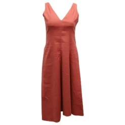 Quelle superbe création est cette robe de Theory! Accentué d’un décolleté en V plongeant et d’un style sans manches, cette robe est faite dans une silhouette midi en utilisant un tissu de lin rouge orange. Son design galbé est ensuite pourvu d’une fermeture éclair pour la fixation. Complétez cette beauté avec des talons noirs pour un look chic.