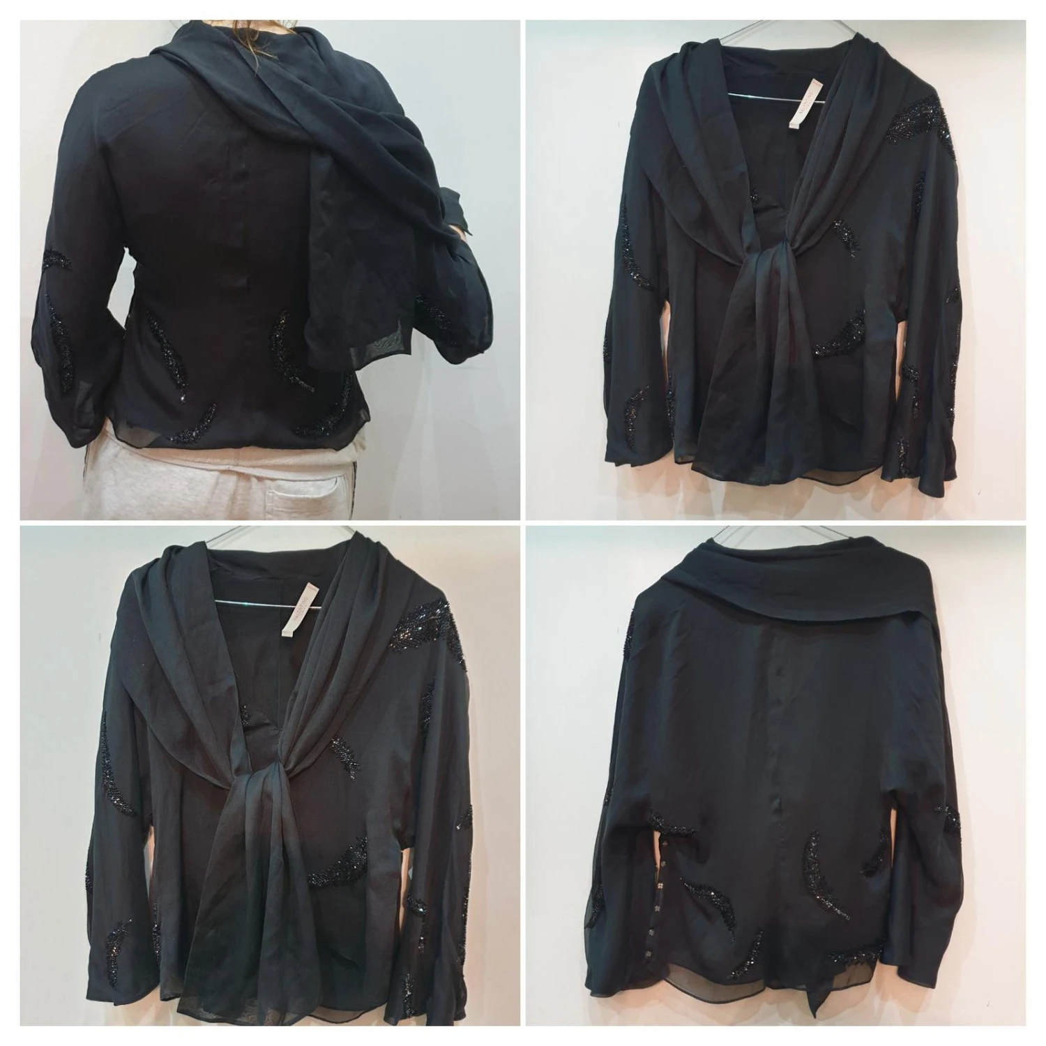 Laçage latéral au milieu du buste avec boutons à clip, manches évasées et écharpe en étole appliquée pouvant être portée en châle sur les épaules ou en foulard noué voir photo