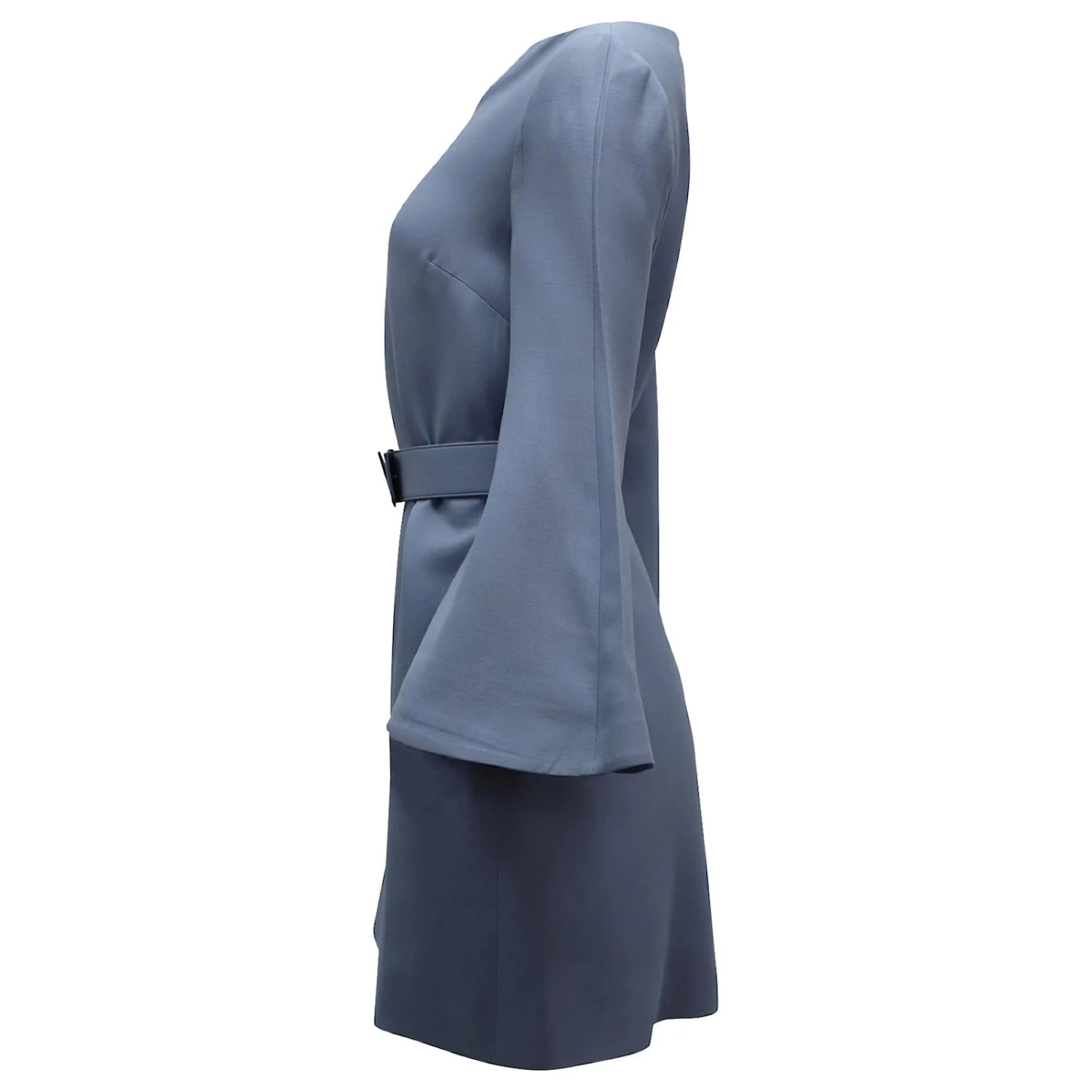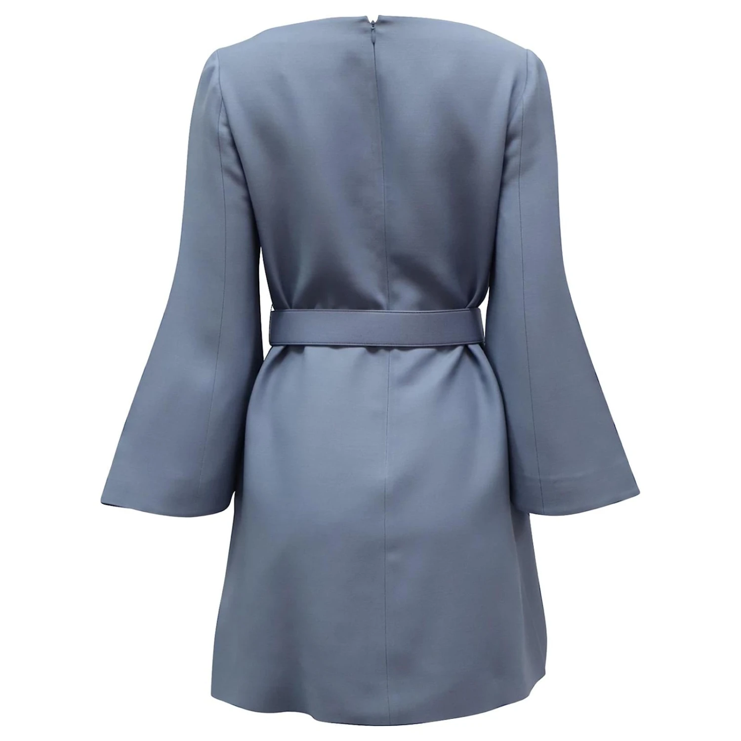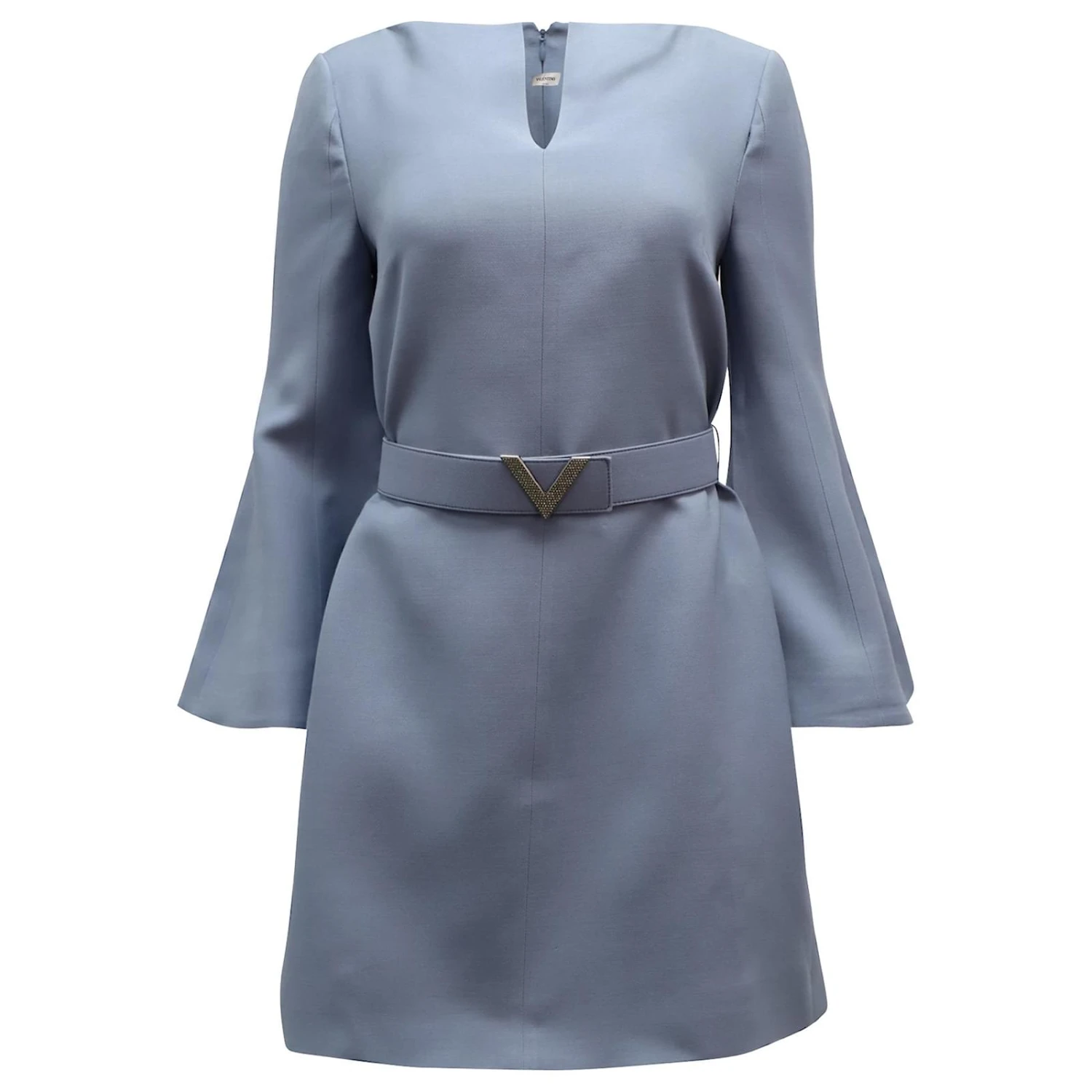 Une silhouette à taille ceinturée et une fabrication structurée en sergé de laine et de soie confèrent à cette robe Valentino une allure sophistiquée. Le style écrémé sur les cuisses est proposé dans un doux coloris bleu « Cloud », et sa coupe droite est compensée par des manches évasées et un décolleté précisément fendu.