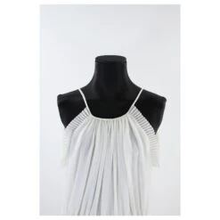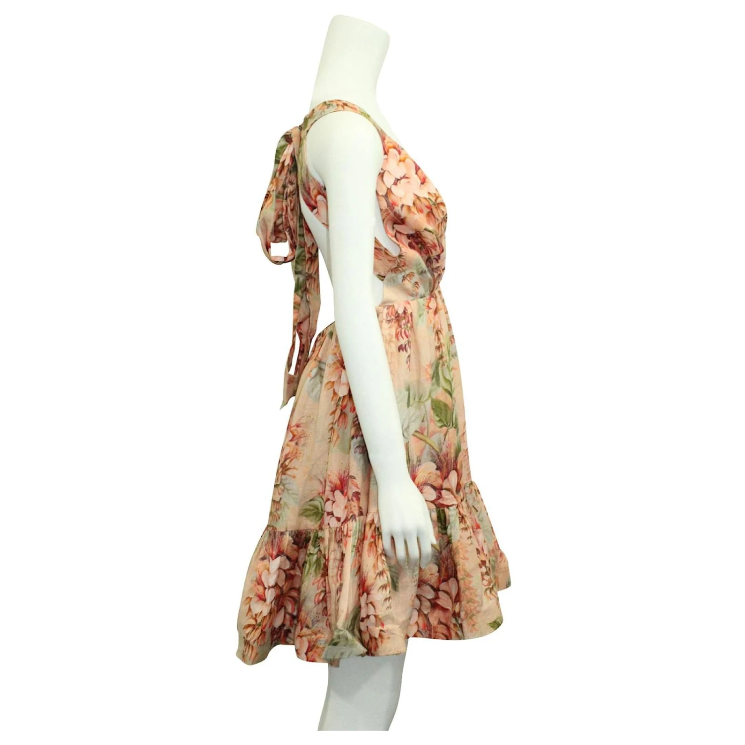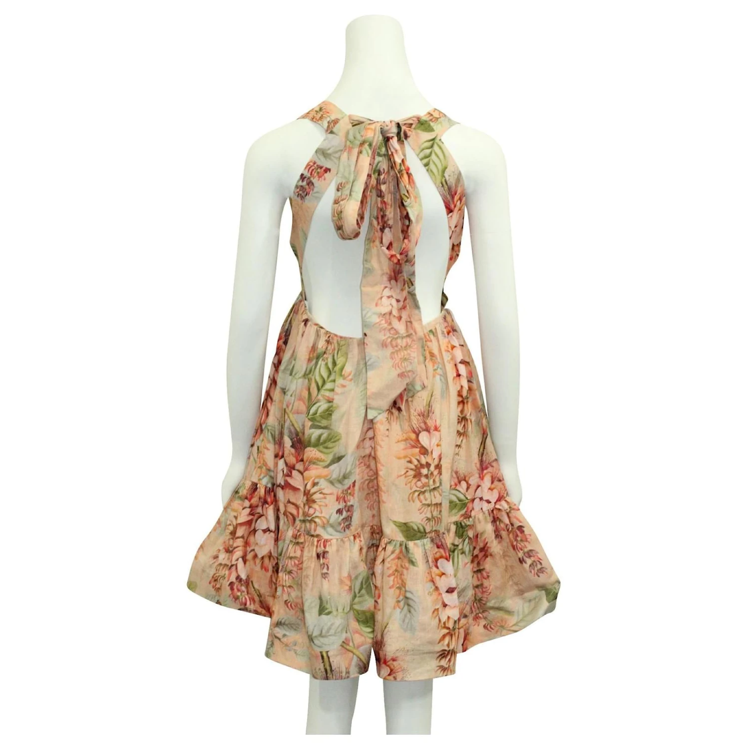col en V profond, robe dos nu à fleurs. Jupe évasée à volants, Doublé. Fermeture à glissière et lien au dos. 100% lin. In excellent condition. made in china.